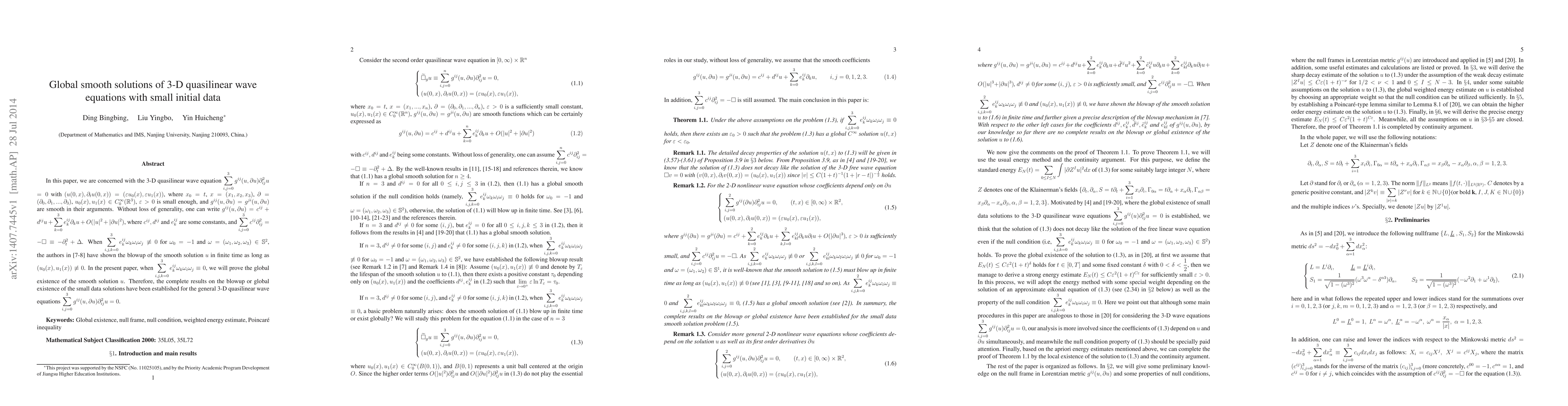 This paper establishes global smooth solutions for 3-D quasilinear wave equations with small initial data, resolving the blowup question under specific conditions.