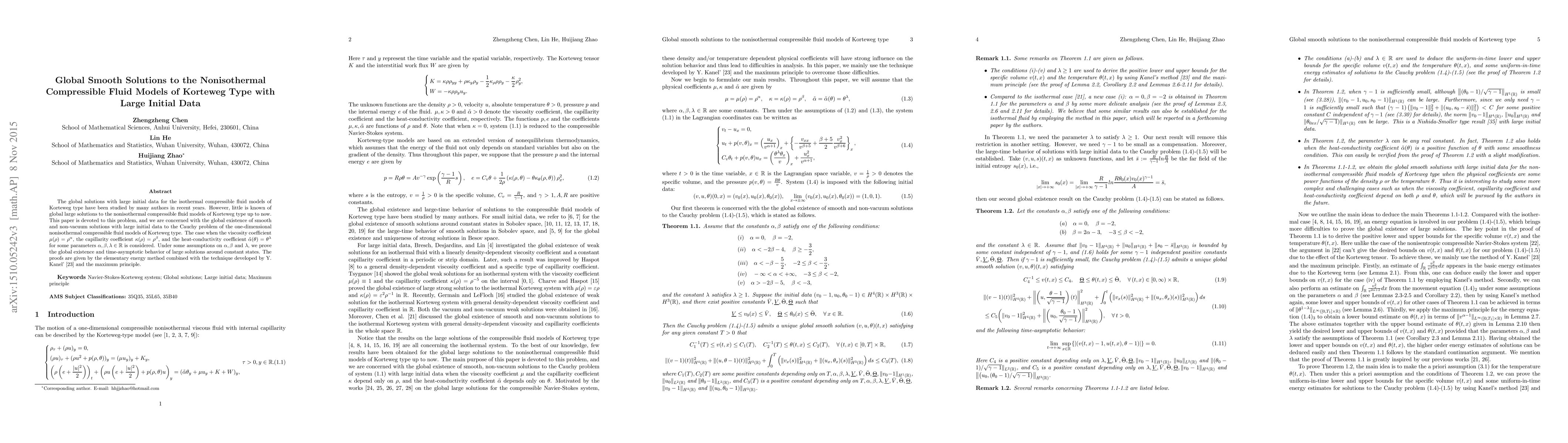This paper investigates the global existence of smooth, non-vacuum solutions for large initial data in one-dimensional nonisothermal compressible fluid models of Korteweg type. The study employs the elementary energy method and techniques from Y. Kanel's work to prove global existence and time-asymptotic behavior under specific conditions on viscosity, capillarity, and heat-conductivity coefficients.