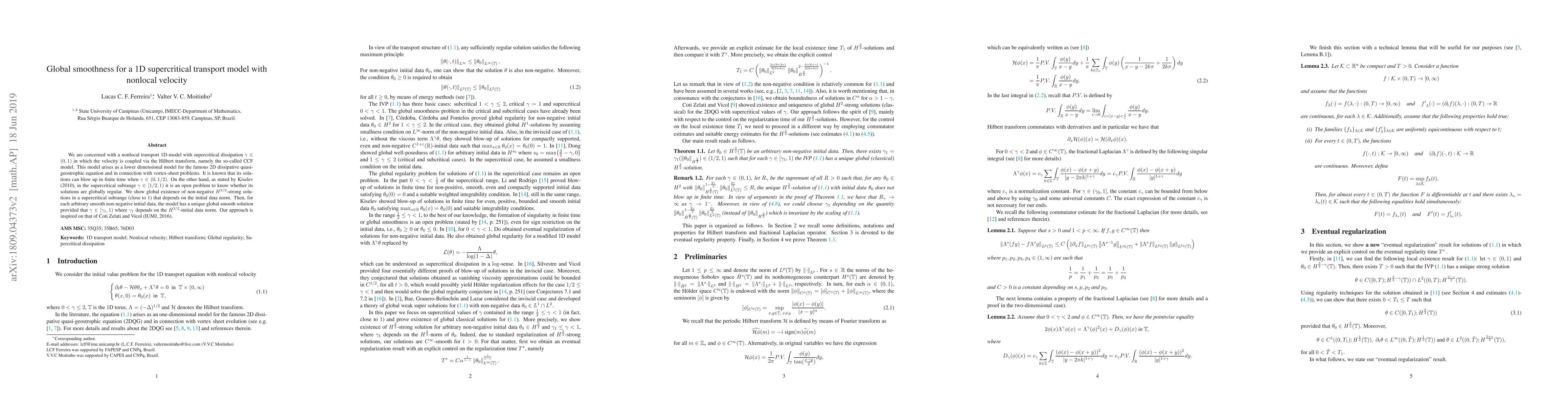 This paper investigates the global regularity of a 1D supercritical transport model with nonlocal velocity, showing global existence of non-negative $H^{3/2}$-strong solutions in a supercritical subrange. It proves the existence of a unique global smooth solution for smooth non-negative initial data under certain conditions.