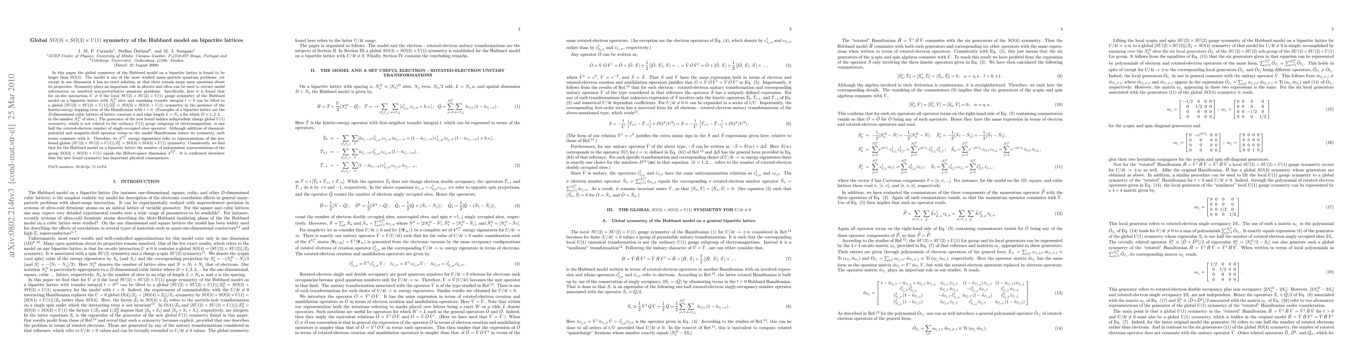 The research reveals that the Hubbard model on bipartite lattices exhibits a global $SO(3)\times SO(3)\times U(1)$ symmetry when the on-site interaction $U\neq 0$ and the transfer integral $t>0$. This symmetry arises from a lifted local gauge symmetry and has significant implications for understanding the properties of hole-doped cuprates.