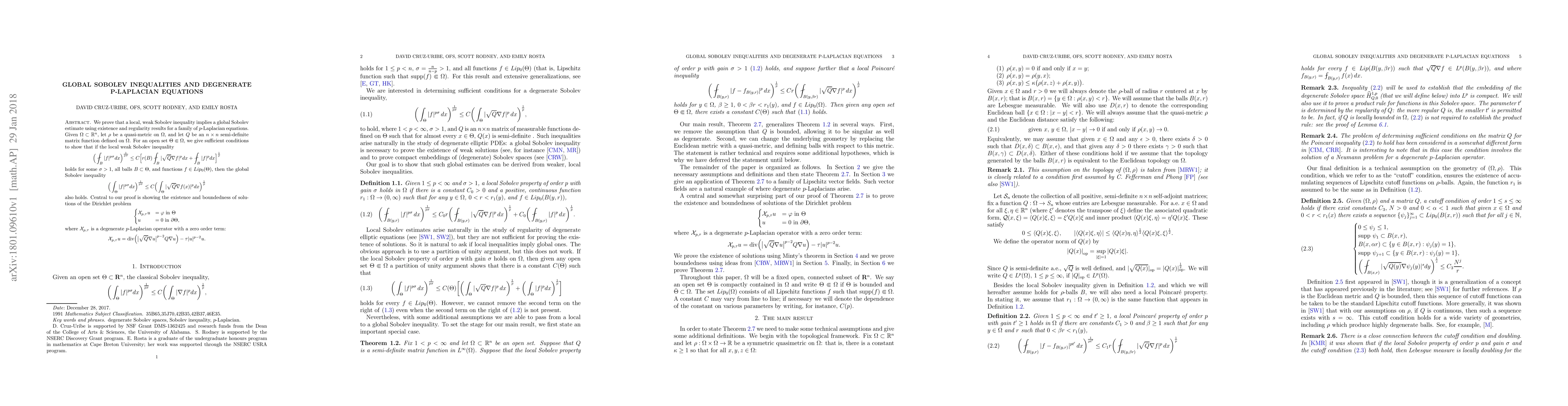 We prove that a local, weak Sobolev inequality implies a global Sobolev estimate using existence and regularity results for a family of $p$-Laplacian equations. Given $\Omega\subset\mathbb{R}^n$, let $\rho$ be a quasi-metric on $\Omega$, and let $Q$ be an $n\times n$ semi-definite matrix function defined on $\Omega$. For an open set $\Theta\Subset\Omega$, we give sufficient conditions to show that if the local weak Sobolev inequality % \[ \Big(\fint_B |f|^{p\sigma}dx\Big)^\frac{1}{p\sigma} \leq C\Big[ r(B)\fint_B |\sqrt{Q}\nabla f|^pdx + \fint_B |f|^pdx\Big]^\frac{1}{p} \] holds for some $\sigma>1$, all balls $B\subset \Theta$, and functions $f\in Lip_0(\Theta)$, then the global Sobolev inequality \[ \Big(\int_\Theta |f|^{p\sigma}dx\Big)^\frac{1}{p\sigma} \leq C\Big(\int_\Theta |\sqrt{Q}\nabla f(x)|^pdx\Big)^\frac{1}{p} \] also holds. Central to our proof is showing the existence and boundedness of solutions of the Dirichlet problem \[ \begin{cases} \mx_{p,\tau} u & = \varphi \text{in} \Theta \\ u & = 0 \text{in} \partial \Theta, \end{cases} \] where $\mx_{p,\tau}$ is a degenerate $p$-Laplacian operator with a zero order term: \[ \mx_{p,\tau} u = \text{div}\Big(\big|\sqrt{Q} \nabla u\big|^{p-2}Q\nabla u\Big) - \tau |u|^{p-2}u. \]