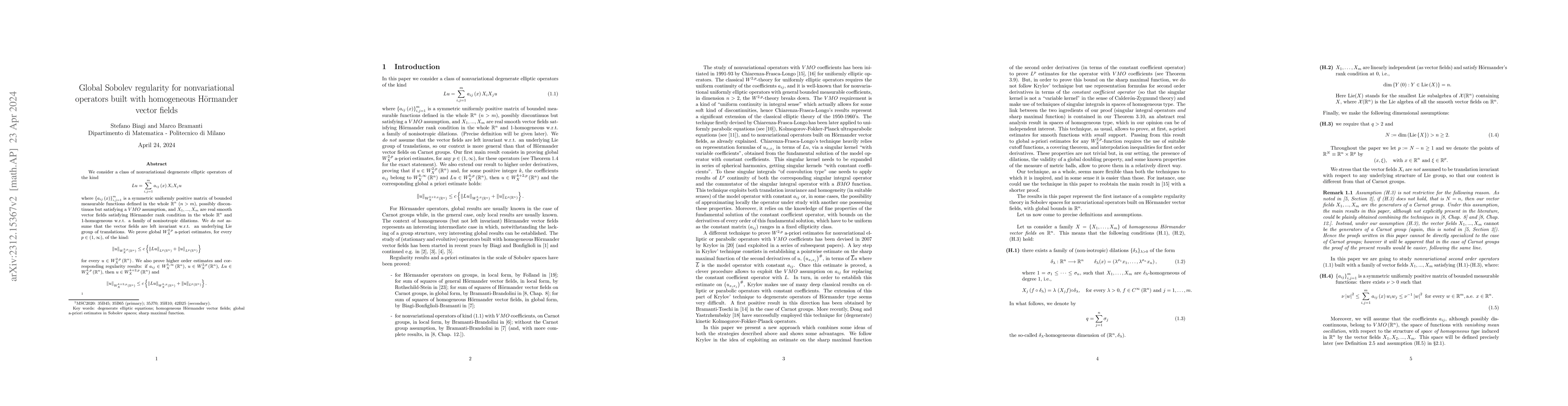 We consider a class of nonvariational degenerate elliptic operators of the kind \[ Lu=\sum_{i,j=1}^{m}a_{ij}\left( x\right) X_{i}X_{j}u \] where $\left\{ a_{ij}\left( x\right) \right\} _{i,j=1}^{m}$ is a symmetric uniformly positive matrix of bounded measurable functions defined in the whole $\mathbb{R}^{n}$ ($n>m$), possibly discontinuos but satisfying a $VMO$ assumption, and $X_{1},...,X_{m}$ are real smooth vector fields satisfying H\"{o}rmander rank condition in the whole $\mathbb{R}^{n}$ and $1$-homogeneous w.r.t. a family of nonisotropic dilations. We do not assume that the vector fields are left invariant w.r.t. an underlying Lie group of translations. We prove global $W_{X}^{2,p}$ a-priori estimates, for every $p\in\left( 1,\infty\right) $, of the kind: \[ \Vert u\Vert_{W_{X}^{2,p}(\mathbb{R}^{n})}\leq c\left\{ \left\Vert Lu\right\Vert _{L^{p}\left( \mathbb{R}^{n}\right) }+\left\Vert u\right\Vert _{L^{p}\left( \mathbb{R}^{n}\right) }\right\} \] for every $u\in W_{X}^{2,p}\left( \mathbb{R}^{n}\right) .$ We also prove higher order estimates and corresponding regularity results: if $a_{ij}\in W_{X}^{k,\infty}\left( \mathbb{R}^{n}\right) $, $u\in W_{X}^{2,p}\left( \mathbb{R}^{n}\right) $, $Lu\in W_{X}^{k,p}\left( \mathbb{R}^{n}\right) $, then $u\in W_{X}^{k+2,p}\left( \mathbb{R}^{n}\right) $ and \[ \Vert u\Vert_{W_{X}^{k+2,p}(\mathbb{R}^{n})}\leq c\left\{ \Vert Lu\Vert_{W_{X}^{k,p}(\mathbb{R}^{n})}+\Vert u\Vert_{L^{p}(\mathbb{R}^{n} )}\right\} . \]