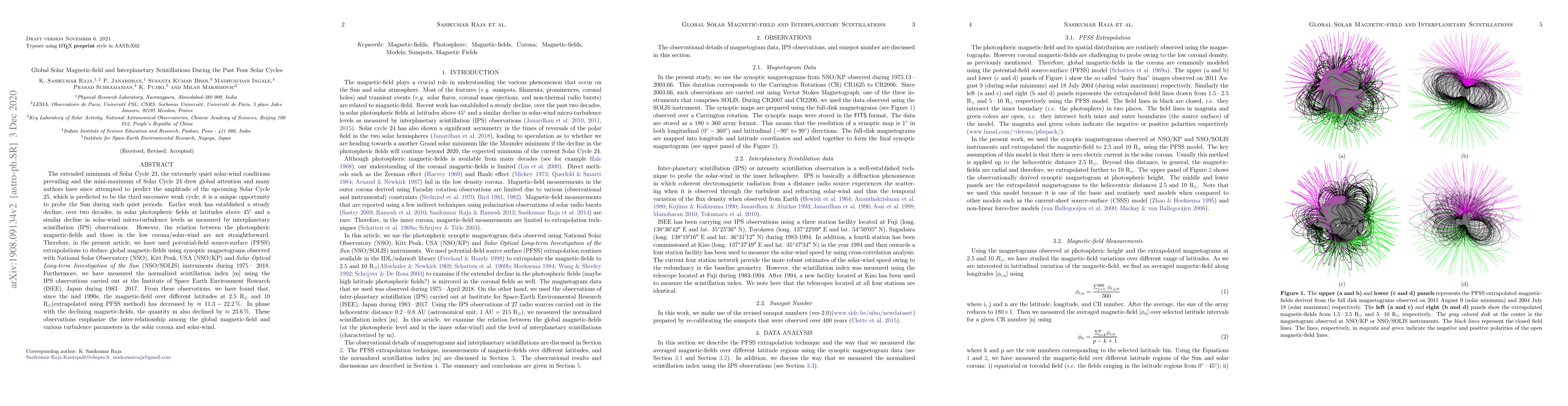 The extended minimum of Solar Cycle 23, the extremely quiet solar-wind conditions prevailing, and the mini-maximum of Solar Cycle 24 drew global attention and many authors have since attempted to predict the amplitude of the upcoming Solar Cycle 25, which is predicted to be the third successive weak cycle; it is a unique opportunity to probe the Sun during such quiet periods. Earlier work has established a steady decline, over two decades, in solar photospheric fields at latitudes above $45^{\circ}$ and a similar decline in solar-wind micro-turbulence levels as measured by interplanetary scintillation (IPS) observations. However, the relation between the photospheric magnetic fields and those in the low corona/solar-wind are not straightforward. Therefore, in the present article, we have used potential-field source-surface (PFSS) extrapolations to deduce global magnetic-fields using synoptic magnetograms observed with National Solar Observatory (NSO), Kitt Peak, USA (NSO/KP) and Solar Optical Long-term Investigation of the Sun (NSO/SOLIS) instruments during 1975-2018. Furthermore, we have measured the normalized scintillation index [m] using the IPS observations carried out at the Institute of Space Earth Environment Research (ISEE), Japan during 1983-2017. From these observations, we have found that, since the mid-1990s, the magnetic-field over different latitudes at 2.5 $\rm R_{\odot}$ and 10 $\rm R_{\odot}$(extrapolated using PFSS method) has decreased by $\approx 11.3-22.2 \%$. In phase with the declining magnetic-fields, the quantity m also declined by $\approx 23.6 \%$. These observations emphasize the inter-relationship between the global magnetic-field and various turbulence parameters in the solar corona and solar wind.
