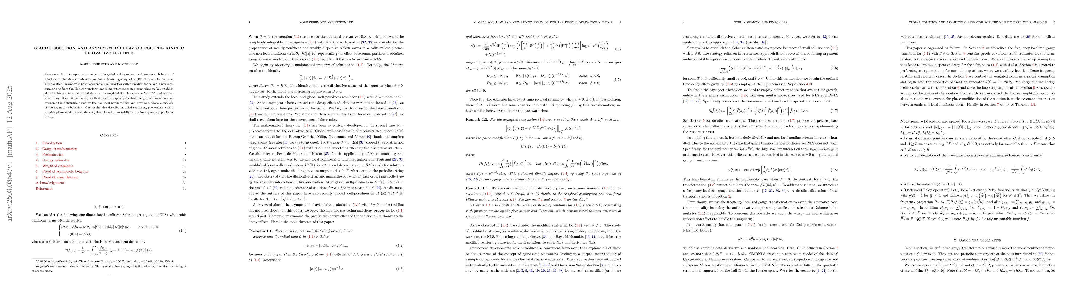 In this paper we investigate the global well-posedness and long-term behavior of solutions to the kinetic derivative nonlinear Schr\"odinger equation (KDNLS) on the real line. The equation incorporates both local cubic nonlinearities with derivative terms and a non-local term arising from the Hilbert transform, modeling interactions in plasma physics. We establish global existence for small initial data in the weighted Sobolev space $H^2 \cap H^{1,1}$ and optimal time decay effect. Using energy methods and a frequency-localized gauge transformation, we overcome the difficulties posed by the non-local nonlinearities and provide a rigorous analysis of the asymptotic behavior. Our results also describe modified scattering phenomena with a suitable phase modification, showing that the solutions exhibit a precise asymptotic profile as $t \to \infty$.