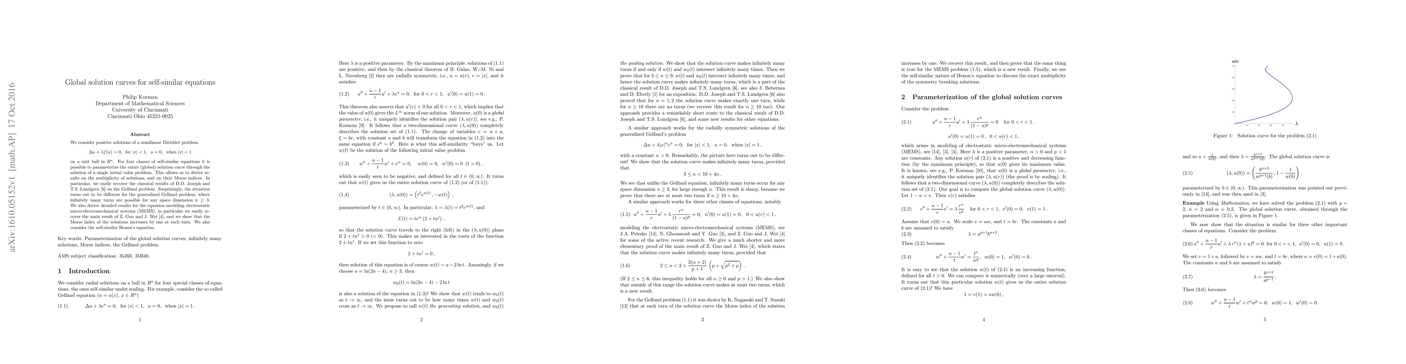 This research derives global solution curves for self-similar equations, parameterizing them via a single initial value problem. It reveals multiplicity and Morse index results for Gelfand and generalized Gelfand problems, and applies findings to electrostatic MEMS equations, showing solution index increase per turn. The study also examines self-similar Henon's equation.