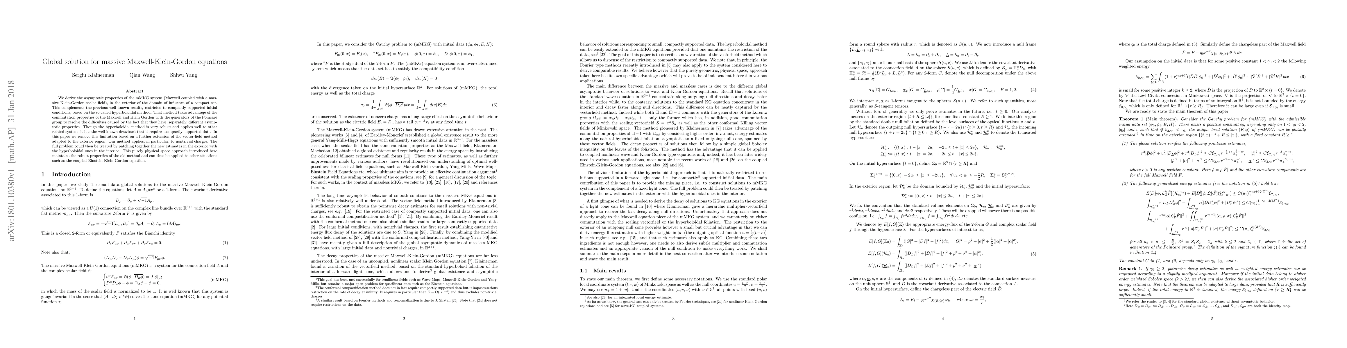We derive the asymptotic properties of the mMKG system (Maxwell coupled with a massive Klein-Gordon scalar field), in the exterior of the domain of influence of a compact set. This complements the previous well known results, restricted to compactly supported initial conditions, based on the so called hyperboloidal method. That method takes advantage of the commutation properties of the Maxwell and Klein Gordon with the generators of the Poincar\'e group to resolve the difficulties caused by the fact that they have, separately, different asymptotic properties. Though the hyperboloidal method is very robust and applies well to other related systems it has the well known drawback that it requires compactly supported data. In this paper we remove this limitation based on a further extension of the vector-field method adapted to the exterior region. Our method applies, in particular, to nontrivial charges. The full problem could then be treated by patching together the new estimates in the exterior with the hyperboloidal ones in the interior. This purely physical space approach introduced here maintains the robust properties of the old method and can thus be applied to other situations such as the coupled Einstein Klein-Gordon equation.