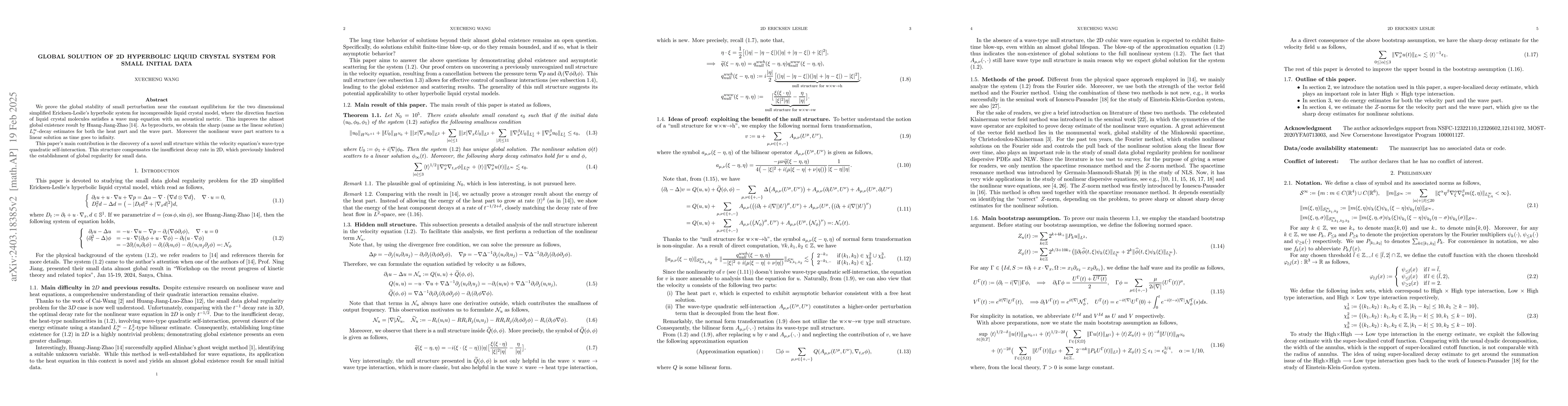 Summary: This paper proves the global stability for small initial perturbations in a 2D hyperbolic liquid crystal system, improving upon previous results with sharper decay estimates. It uncovers a null structure in the velocity equation, leading to scattering of the nonlinear wave part to a linear solution over time.
