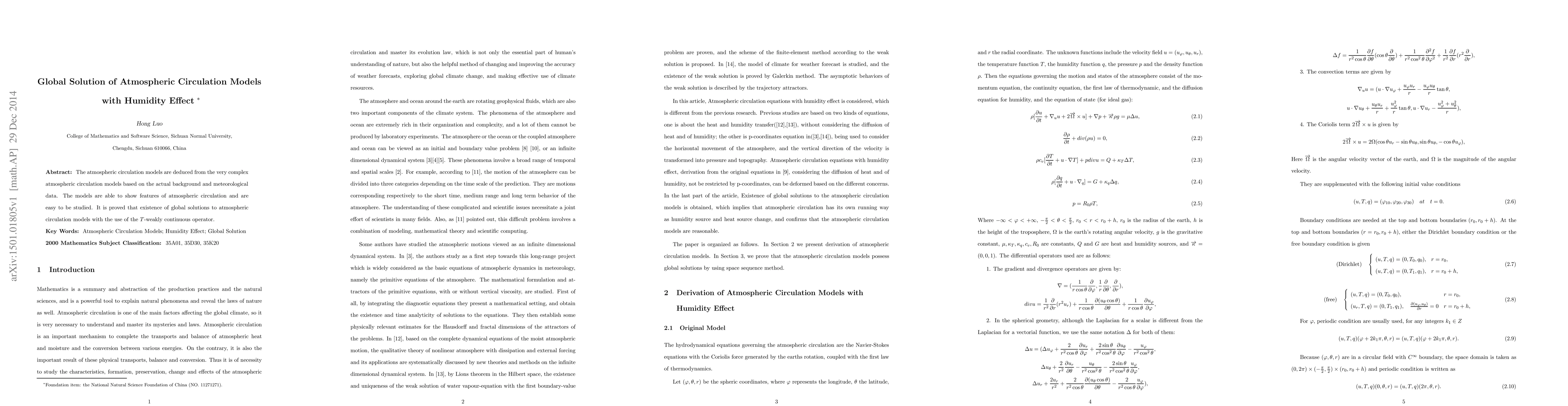 The atmospheric circulation models are deduced from the very complex atmospheric circulation models based on the actual background and meteorological data. The models are able to show features of atmospheric circulation and are easy to be studied. It is proved that existence of global solutions to atmospheric circulation models with the use of the $T$-weakly continuous operator.