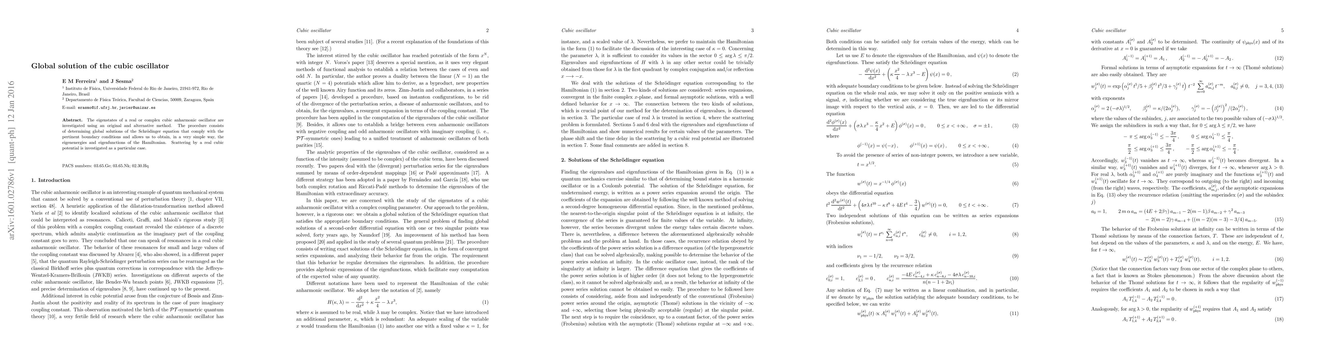 Researchers developed a method to solve the cubic oscillator's Schrödinger equation, finding global solutions that provide eigenenergies and eigenfunctions. This breakthrough has implications for understanding scattering by real cubic potentials.