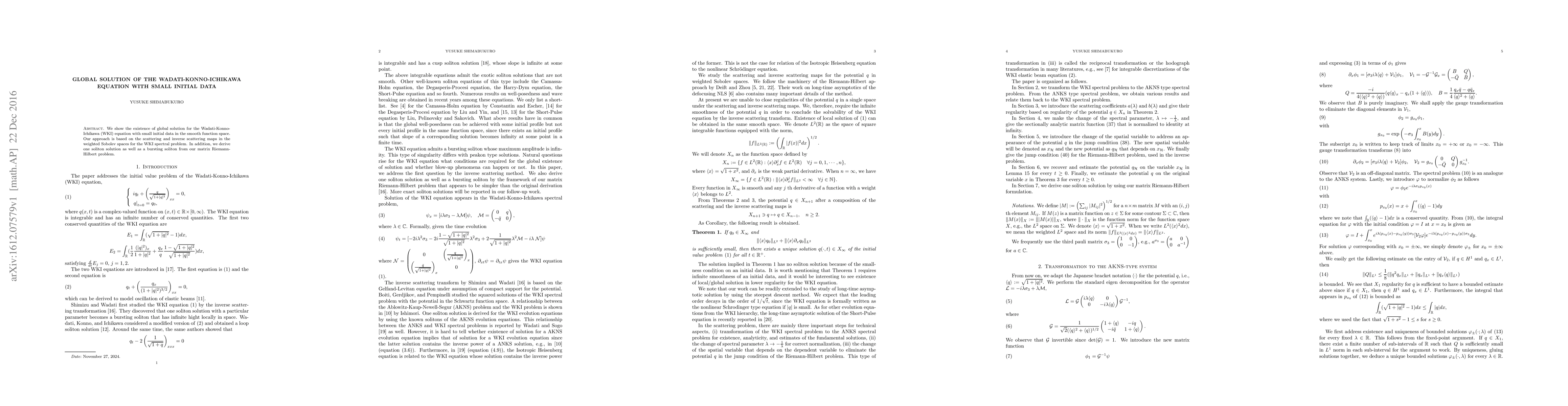 This paper demonstrates the existence of a global solution for the Wadati-Konno-Ichikawa equation under small initial data conditions using scattering and inverse scattering methods in weighted Sobolev spaces. It also derives one soliton and a bursting soliton solution from a matrix Riemann-Hilbert problem.