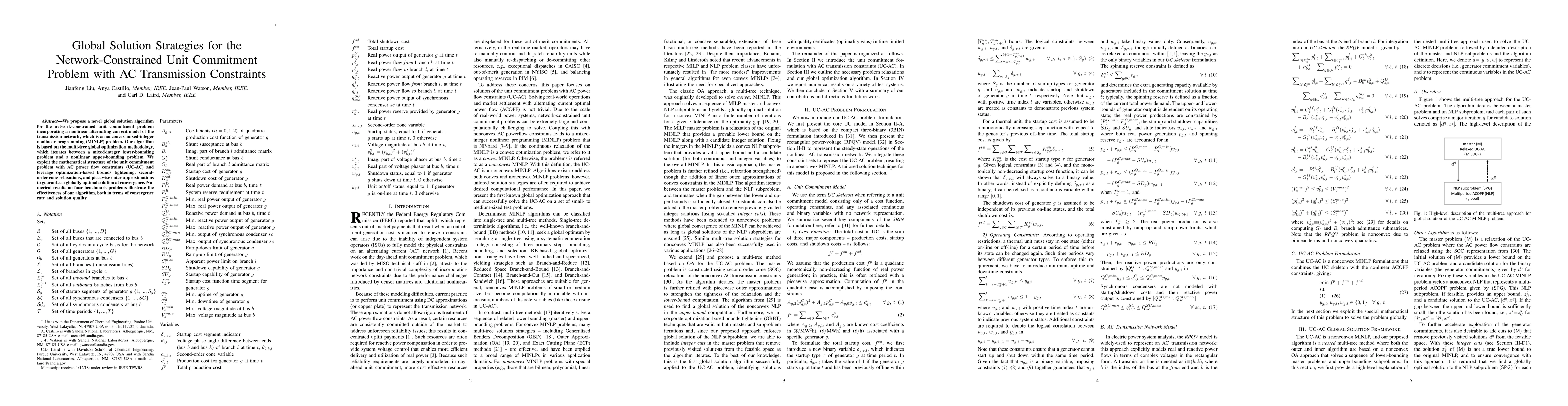 This paper introduces a new global optimization algorithm for the network-constrained unit commitment problem with AC transmission constraints, employing a multi-tree methodology to iteratively solve mixed-integer and nonlinear programming subproblems. The approach guarantees global optimality through optimization-based bounds tightening and relaxations, as demonstrated by effective numerical results on benchmark problems.