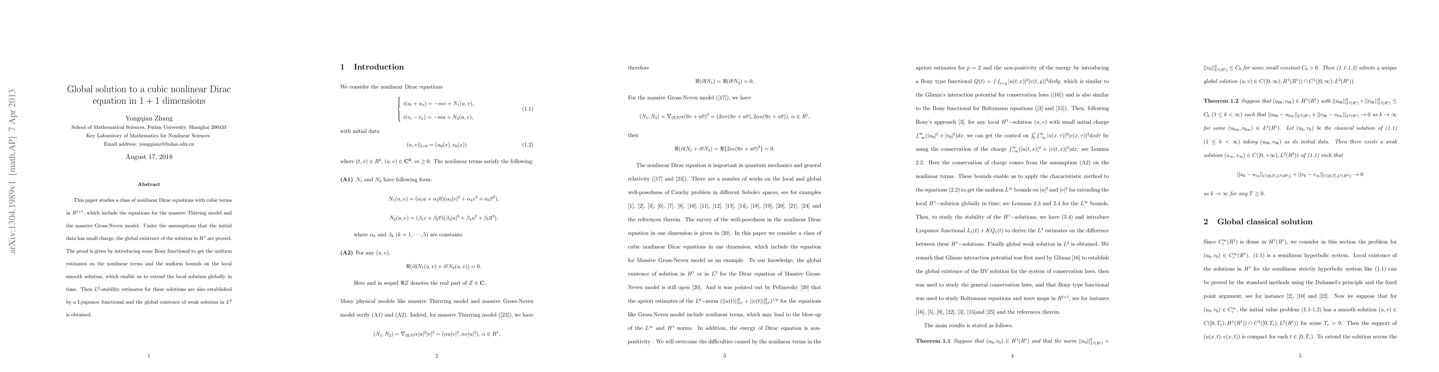 This paper studies a class of nonlinear Dirac equations with cubic terms in $R^{1+1}$, which include the equations for the massive Thirring model and the massive Gross-Neveu model. Under the assumptions that the initial data has small charge, the global existence of the solution in $H^1$ are proved. The proof is given by introducing some Bony functional to get the uniform estimates on the nonlinear terms and the uniform bounds on the local smooth solution, which enable us to extend the local solution globally in time. Then $L^2$-stability estimates for these solutions are also established by a Lyapunov functional and the global existence of weak solution in $L^2$ is obtained.