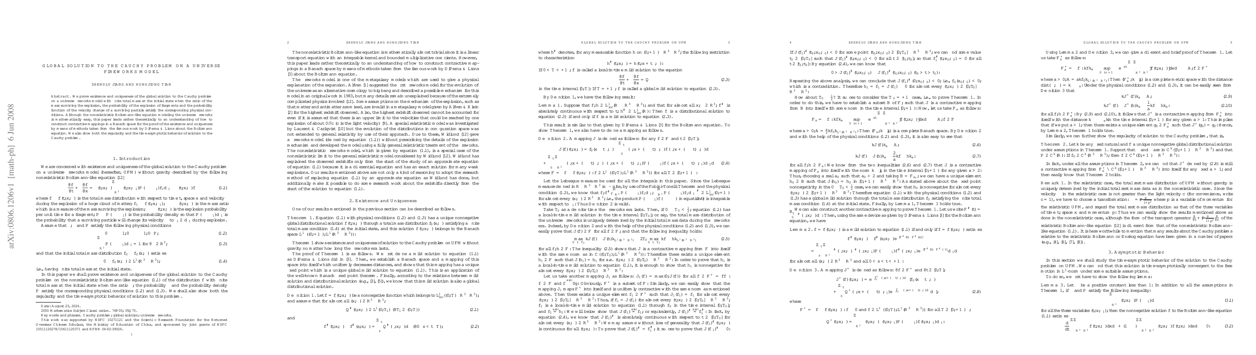 This paper proves the existence and uniqueness of a global solution to the Cauchy problem for a universe fireworks model with specific physical conditions, using a Banach space approach inspired by DiPerna & Lions' work on the Boltzmann equation.