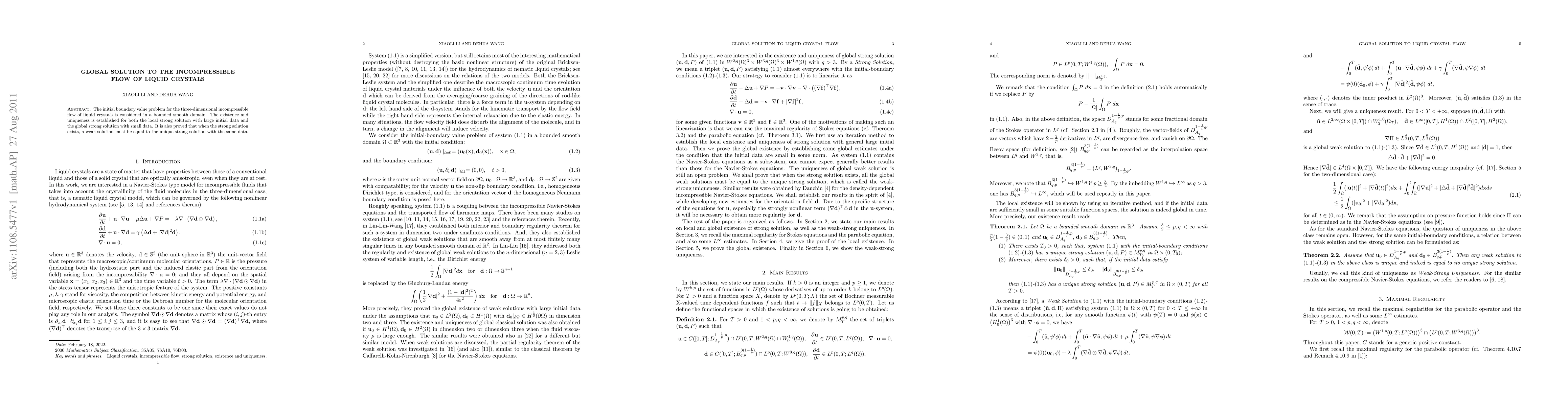 The paper establishes existence and uniqueness of solutions to incompressible flow of liquid crystals, proving a strong solution is globally unique for small initial data, with implications for modeling complex fluid dynamics.