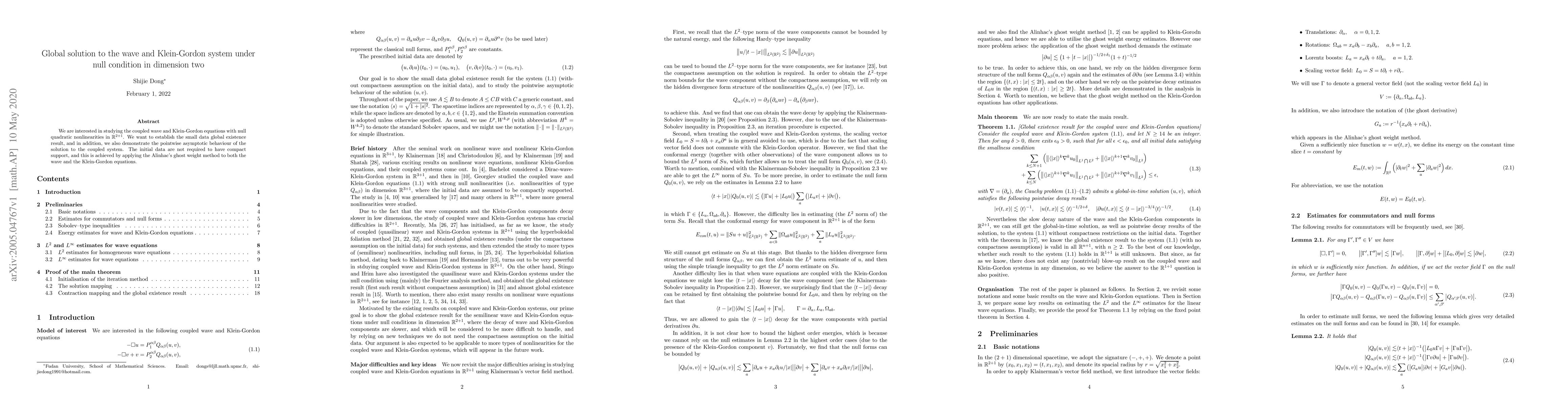 This paper investigates the coupled wave and Klein-Gordon equations in 2+1 dimensions with null quadratic nonlinearities, establishing small data global existence and demonstrating pointwise asymptotic behavior of the solutions. The method leverages Alinhac's ghost weight technique, allowing for solutions with non-compactly supported initial data.