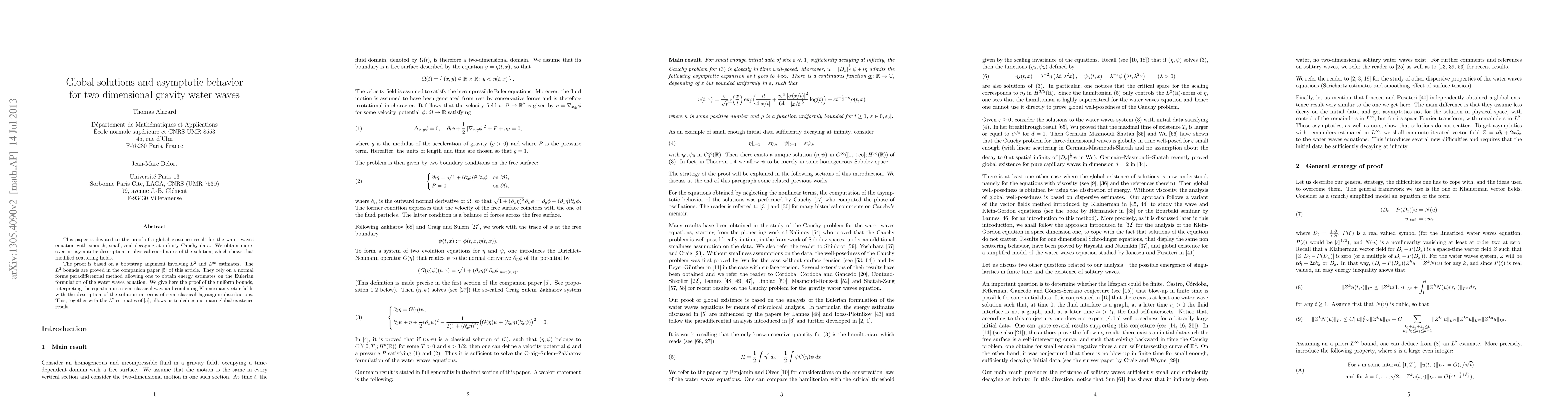 This paper proves global existence for the two-dimensional water waves equation with smooth, small, and decaying initial data, and describes the asymptotic behavior of the solution, showing modified scattering. The proof utilizes a bootstrap argument with $L^2$ and $L^\infty$ estimates, relying on a normal forms paradifferential method and Klainerman vector fields.