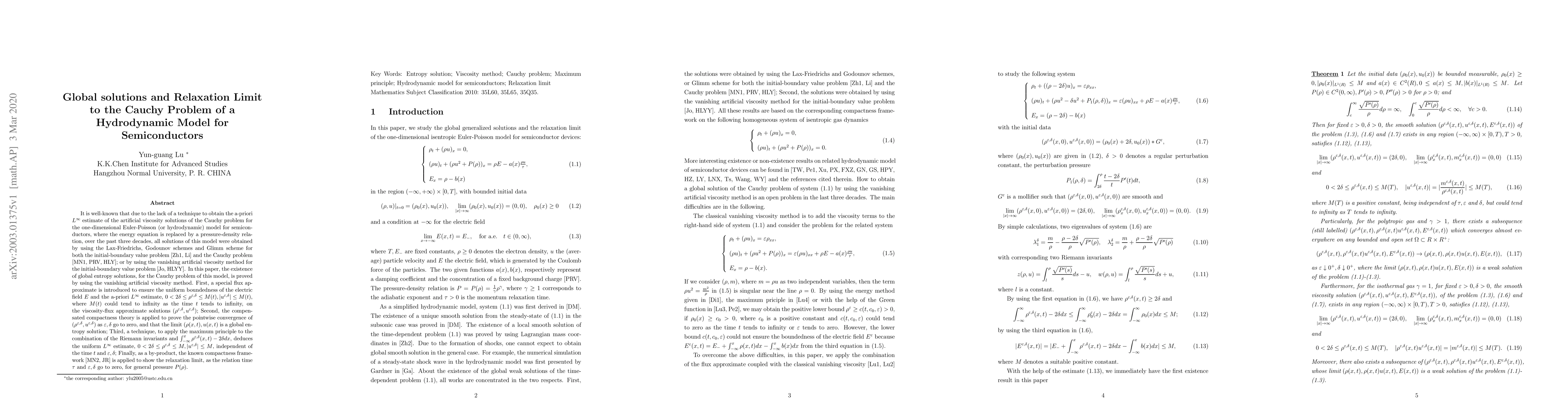 It is well-known that due to the lack of a technique to obtain the a-priori $L^{\infty}$ estimate of the artificial viscosity solutions of the Cauchy problem for the one-dimensional Euler-Poisson (or hydrodynamic) model for semiconductors, where the energy equation is replaced by a pressure-density relation, over the past three decades, all solutions of this model were obtained by using the Lax-Friedrichs, Godounov schemes and Glimm scheme for both the initial-boundary value problem \cite{Zh1,Li} and the Cauchy problem \cite{MN1,PRV,HLY}; or by using the vanishing artificial viscosity method for the initial-boundary value problem \cite{Jo,HLYY}. In this paper, the existence of global entropy solutions, for the Cauchy problem of this model, is proved by using the vanishing artificial viscosity method. As a by-product, the known compactness framework \cite{MN2,JR} is applied to show the relaxation limit, as the relation time $ \tau$ and $\E,\delta$ go to zero, for general pressure $P(\rho)$.