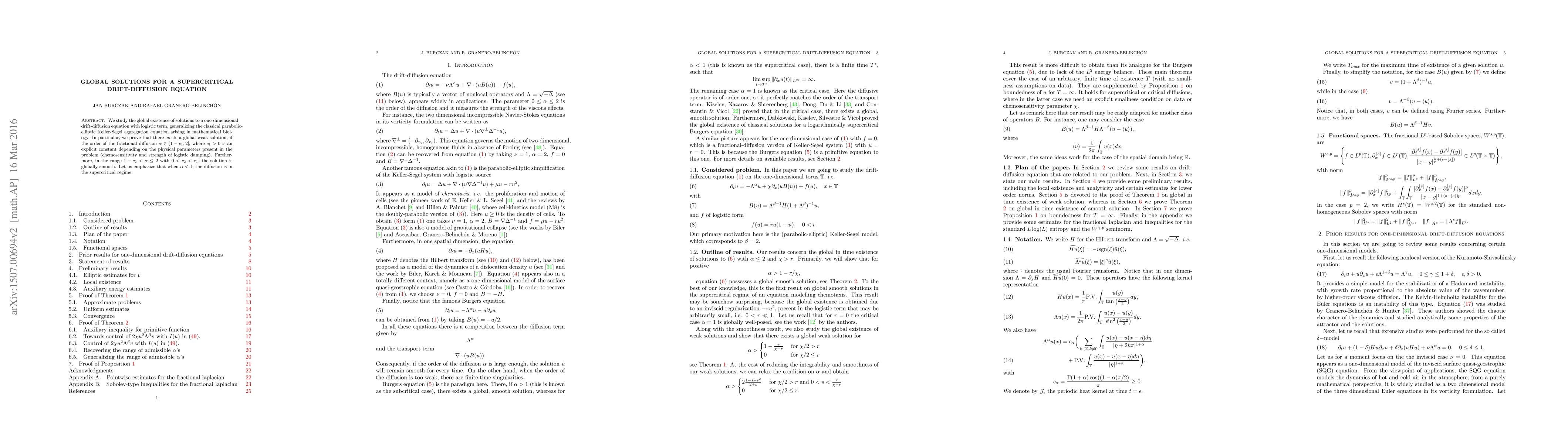 This paper investigates the global existence of weak solutions to a supercritical drift-diffusion equation with a logistic term, generalizing the Keller-Segel model. It proves global weak solutions exist for certain fractional diffusion orders, with global smoothness in a narrower range.