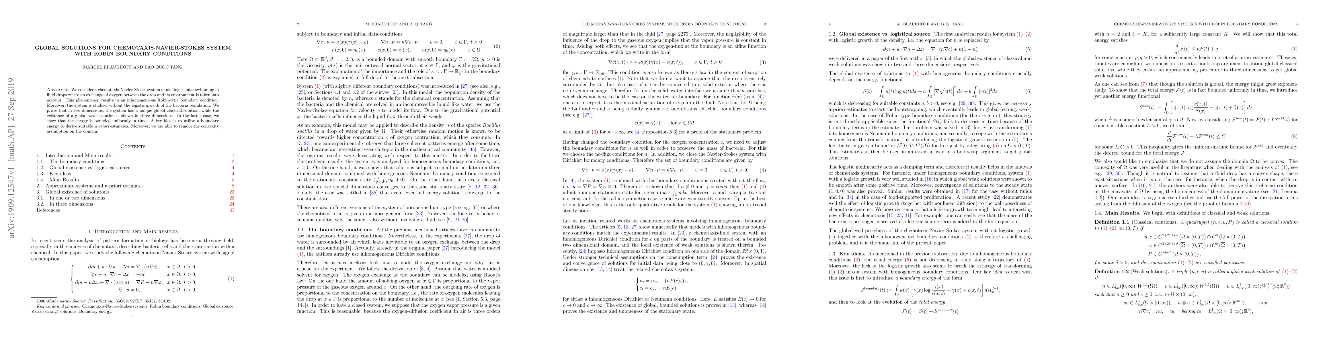 This paper studies a chemotaxis-Navier-Stokes system with Robin boundary conditions, proving the existence of a unique global classical solution in 2D and a global weak solution in 3D with uniformly bounded energy. The key method involves using a boundary energy to derive a priori estimates.