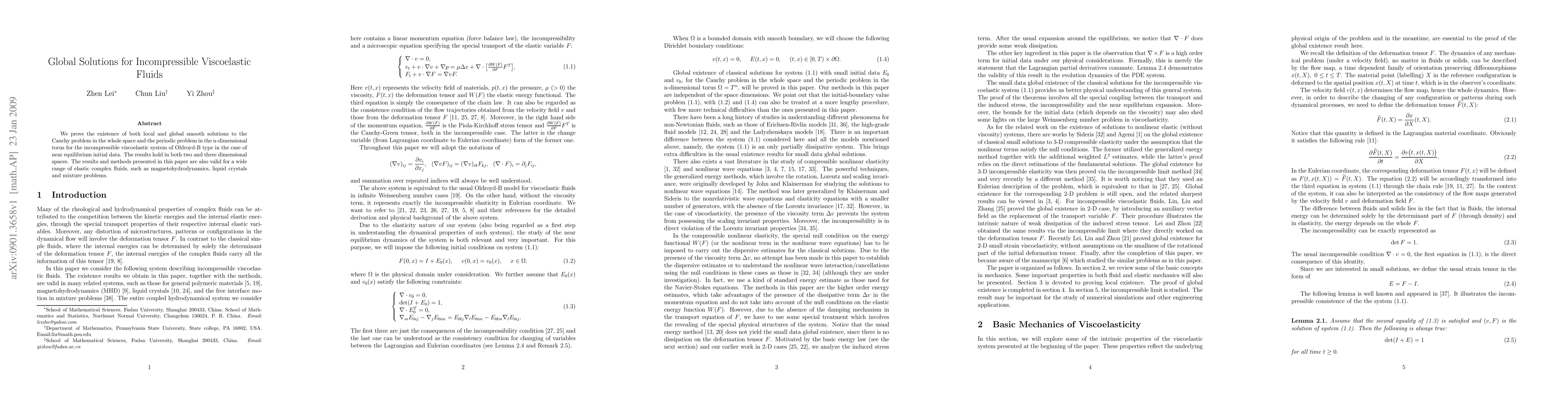 We prove the existence of both local and global smooth solutions to the Cauchy problem in the whole space and the periodic problem in the n-dimensional torus for the incompressible viscoelastic system of Oldroyd-B type in the case of near equilibrium initial data. The results hold in both two and three dimensional spaces. The results and methods presented in this paper are also valid for a wide range of elastic complex fluids, such as magnetohydrodynamics, liquid crystals and mixture problems.