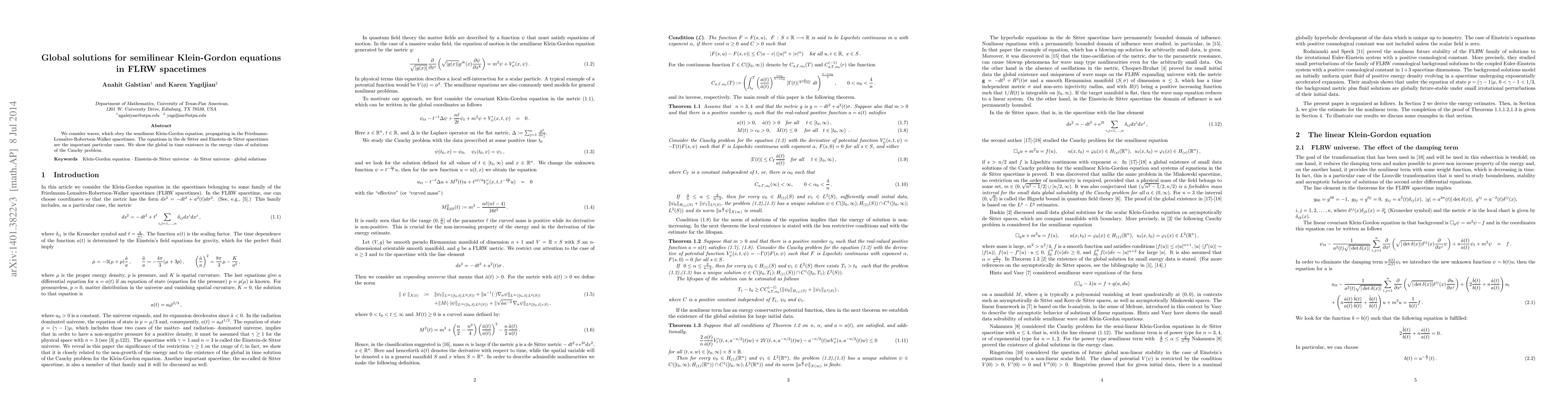 We consider waves, which obey the semilinear Klein-Gordon equation, propagating in the Friedmann-Lemaitre-Robertson-Walker spacetimes. The equations in the de Sitter and Einstein-de Sitter spacetimes are the important particular cases. We show the global in time existence in the energy class of solutions of the Cauchy problem.