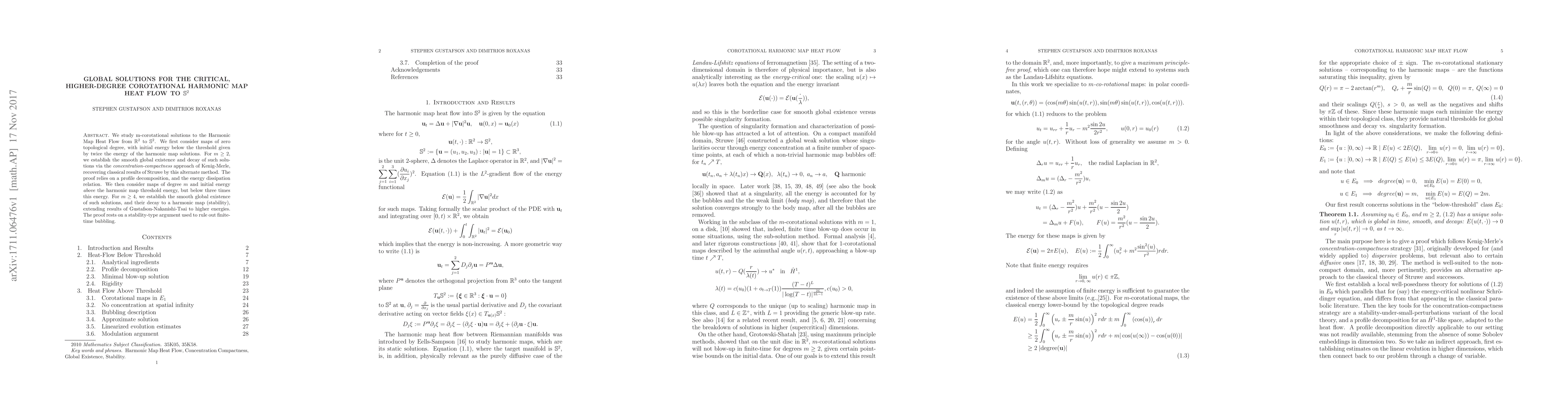 We study m-corotational solutions to the Harmonic Map Heat Flow from $\mathbb{R}^2$ to $\mathbb{S}^2$. We first consider maps of zero topological degree, with initial energy below the threshold given by twice the energy of the harmonic map solutions. For $m \geq 2$, we establish the smooth global existence and decay of such solutions via the {\it concentration-compactness} approach of Kenig-Merle, recovering classical results of Struwe by this alternate method. The proof relies on a profile decomposition, and the energy dissipation relation. We then consider maps of degree $m$ and initial energy above the harmonic map threshold energy, but below three times this energy. For $m \geq 4$, we establish the smooth global existence of such solutions, and their decay to a harmonic map (stability), extending results of Gustafson-Nakanishi-Tsai to higher energies. The proof rests on a stability-type argument used to rule out finite-time bubbling.