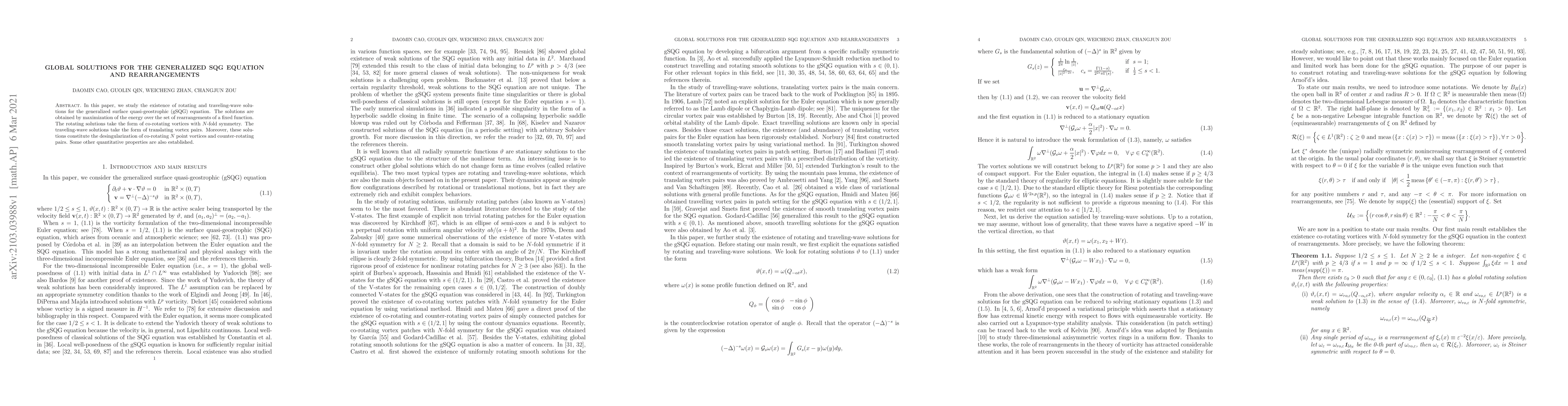 This paper finds rotating and traveling-wave solutions for a generalized surface quasi-geostrophic equation, describing co-rotating vortices and translating vortex pairs with specific symmetries.