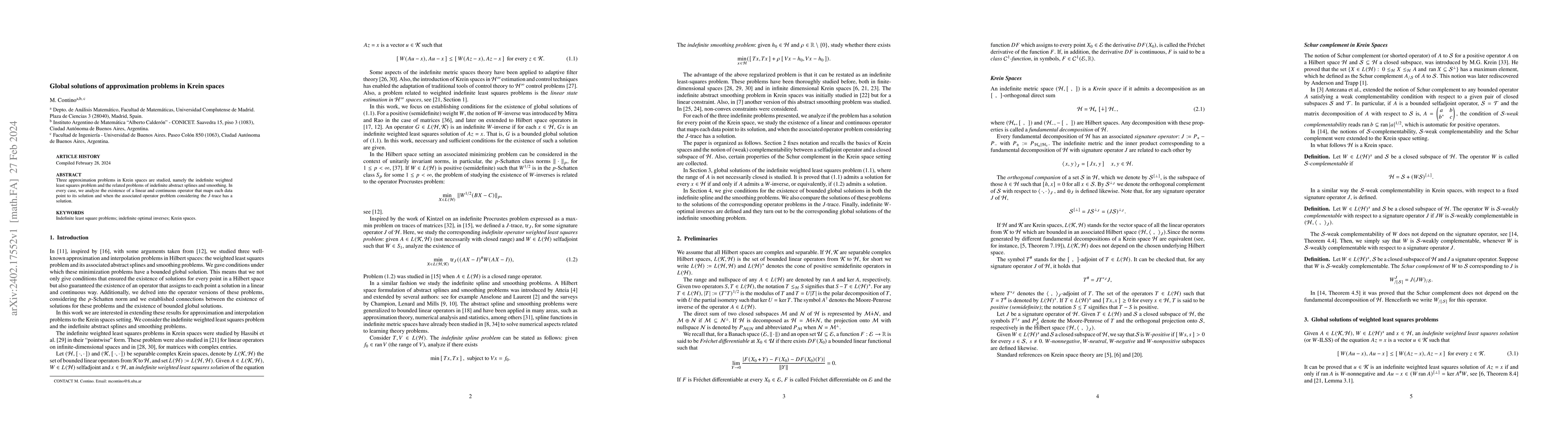 This paper investigates the global solutions of three approximation problems in Krein spaces, focusing on the indefinite weighted least squares problem, indefinite abstract splines, and smoothing. It examines the existence of solutions for every point in the space and the existence of a linear, continuous operator mapping data points to their respective solutions, along with the J-trace operator problem.