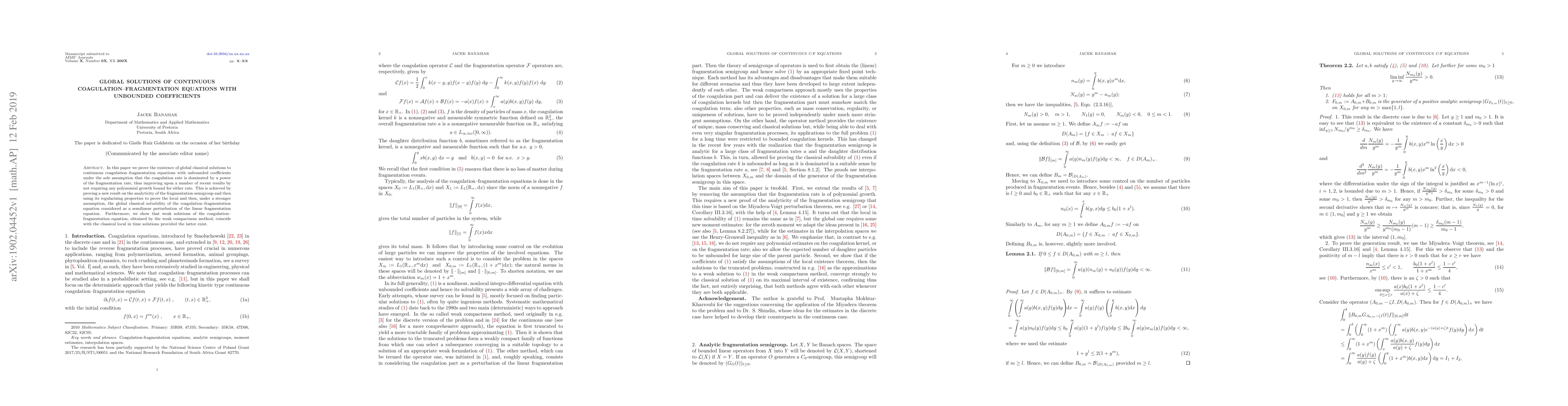 This paper proves the existence of global classical solutions for continuous coagulation-fragmentation equations with unbounded coefficients, improving upon existing results by not requiring polynomial growth bounds. The key is a new analyticity result for the fragmentation semigroup, which is used to establish the local and global solvability.