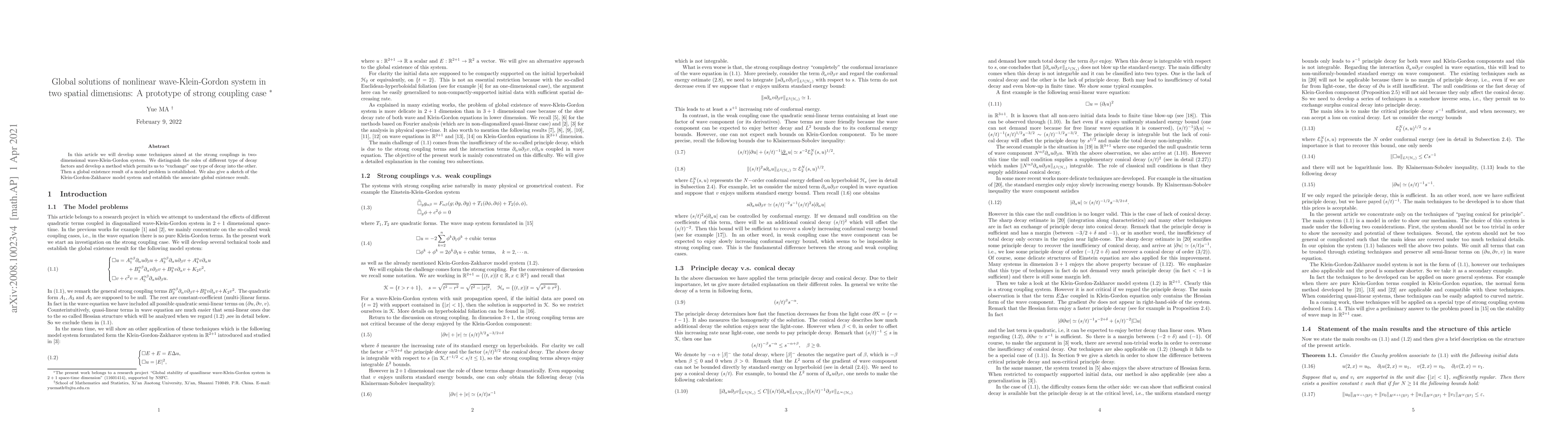 This paper develops techniques for strong coupling in a two-dimensional wave-Klein-Gordon system, focusing on decay factors and their interconversion. It establishes global existence results for both the wave-Klein-Gordon and Klein-Gordon-Zakharov systems.