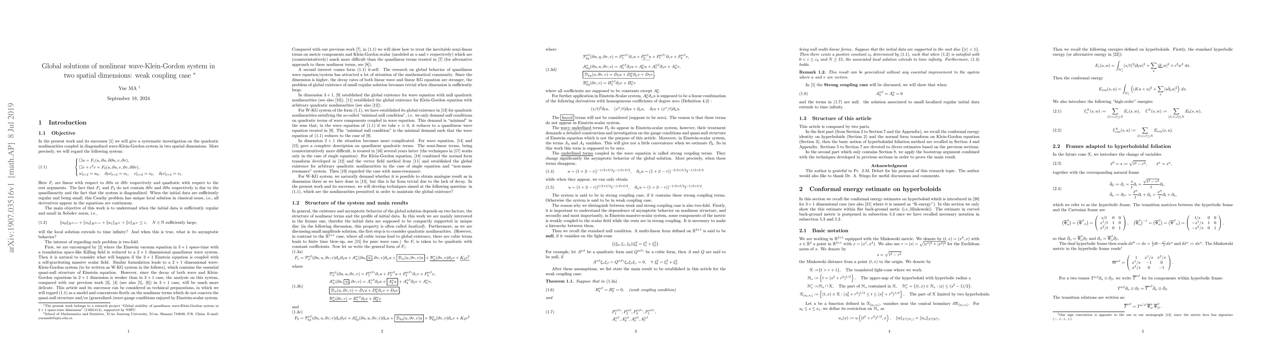 This paper proves the global existence of solutions for a weakly coupled nonlinear wave-Klein-Gordon system in $2+1$ dimensions, utilizing conformal energy estimates and normal form transformations tailored for the specific dimensional context.