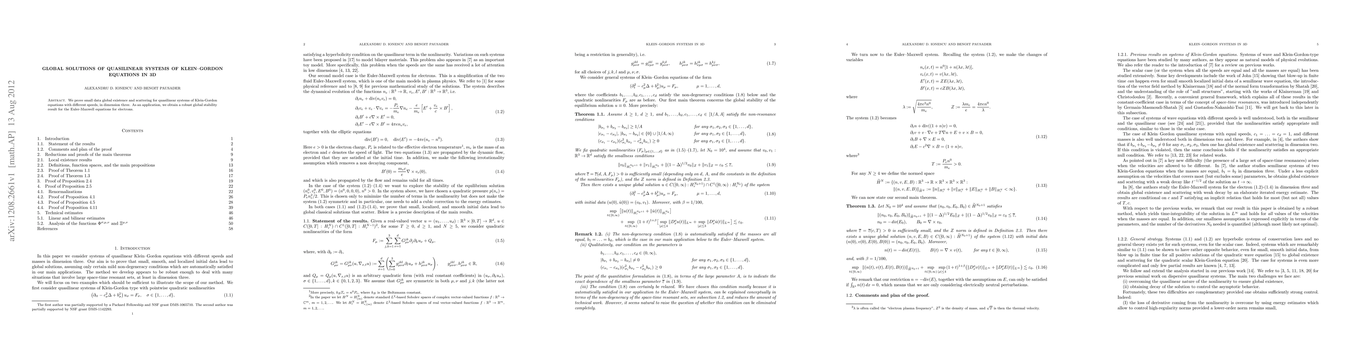 We prove small data global existence and scattering for quasilinear systems of Klein-Gordon equations with different speeds, in dimension three. As an application, we obtain a robust global stability result for the Euler-Maxwell equations for electrons.