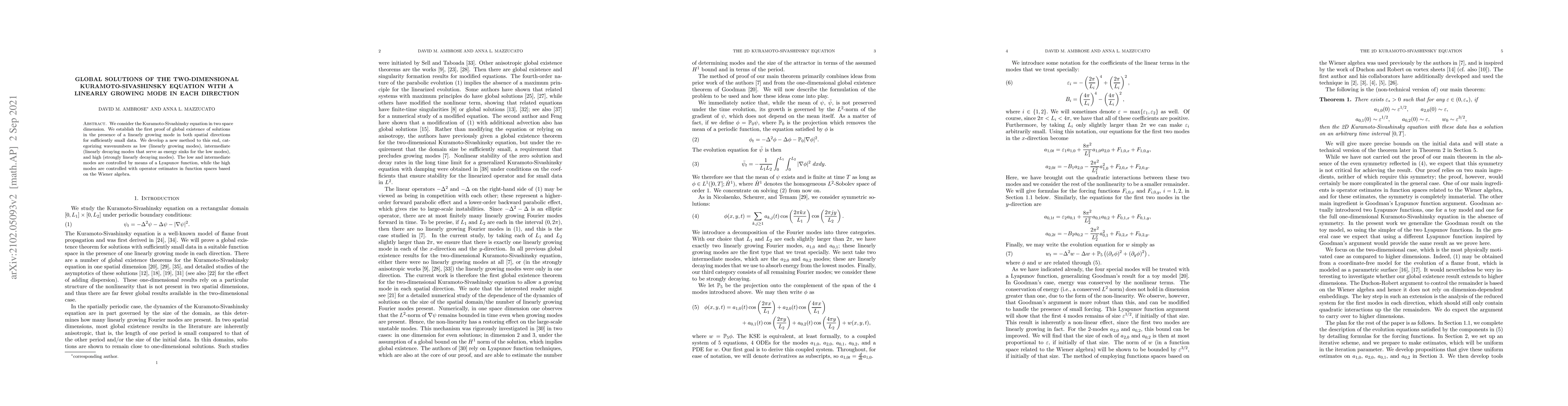 This paper presents the first proof of global solutions for the two-dimensional Kuramoto-Sivashinsky equation with linearly growing modes in both spatial directions. The authors develop a novel method categorizing wavenumbers into low, intermediate, and high modes, controlling the low and intermediate modes via a Lyapunov function and high modes using operator estimates.