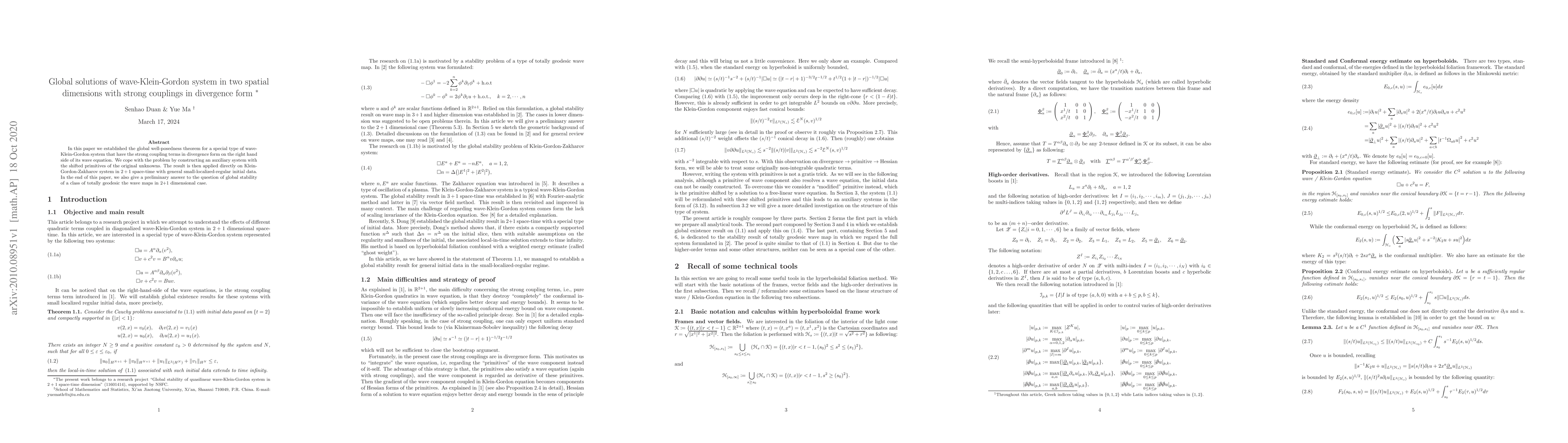 This paper establishes global well-posedness for a wave-Klein-Gordon system with strong coupling terms in divergence form, using an auxiliary system with shifted primitives. It applies the result to the Klein-Gordon-Zakharov system in 2+1 dimensions and provides preliminary insights into the global stability of certain wave maps.