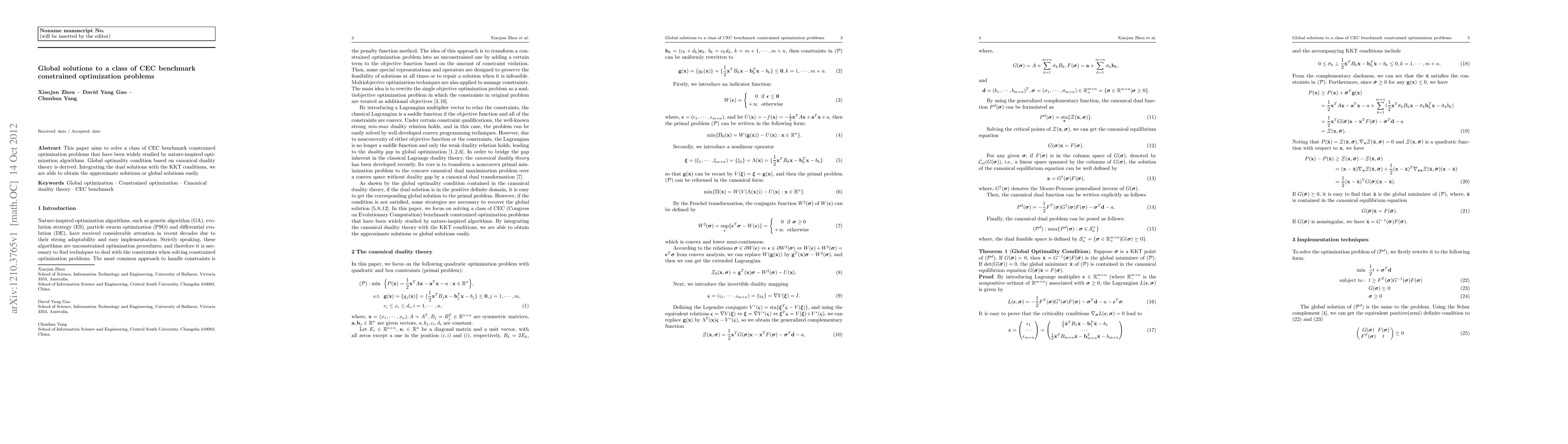 This paper aims to solve a class of CEC benchmark constrained optimization problems that have been widely studied by nature-inspired optimization algorithms. Global optimality condition based on canonical duality theory is derived. Integrating the dual solutions with the KKT conditions, we are able to obtain the approximate solutions or global solutions easily.