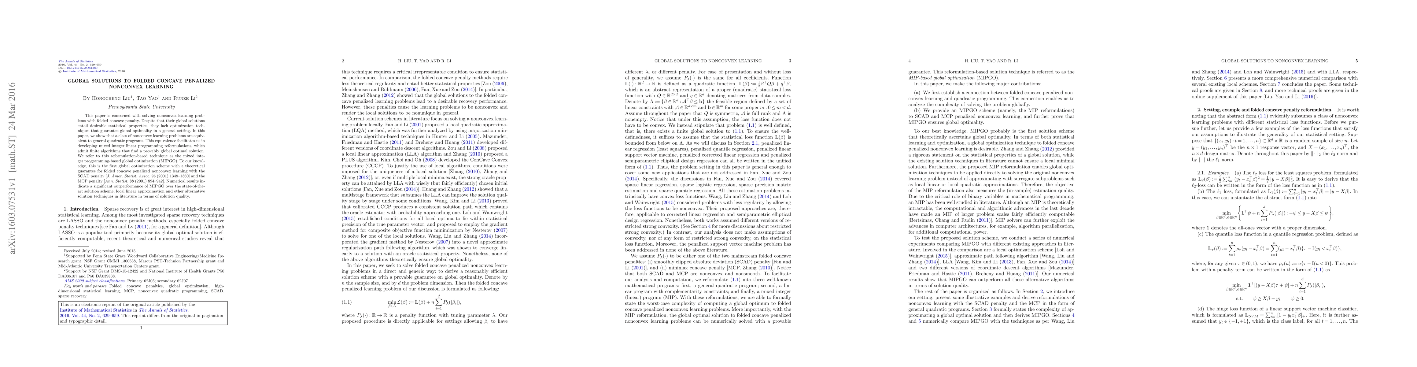 This paper presents a new global optimization technique, MIPGO, for solving nonconvex learning problems with folded concave penalties, reformulating them as quadratic programs and using mixed integer linear programming to find global optimal solutions. Numerical results show MIPGO significantly outperforms existing local methods.