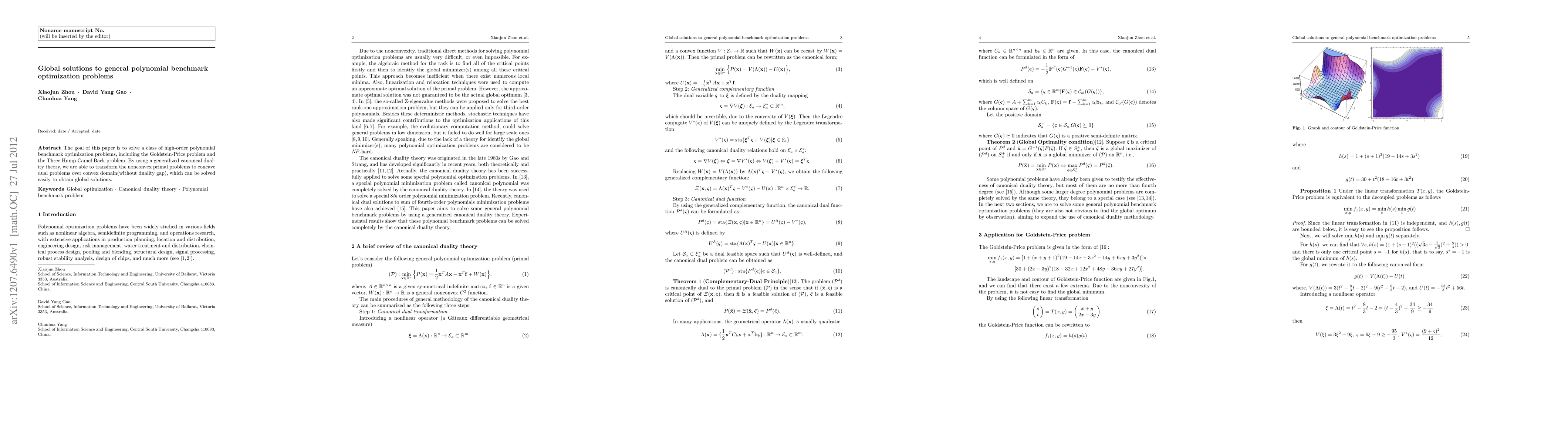 The goal of this paper is to solve a class of high-order polynomial benchmark optimization problems, including the Goldstein-Price problem and the Three Hump Camel Back problem. By using a generalized canonical duality theory, we are able to transform the nonconvex primal problems to concave dual problems over convex domain(without duality gap), which can be solved easily to obtain global solutions.