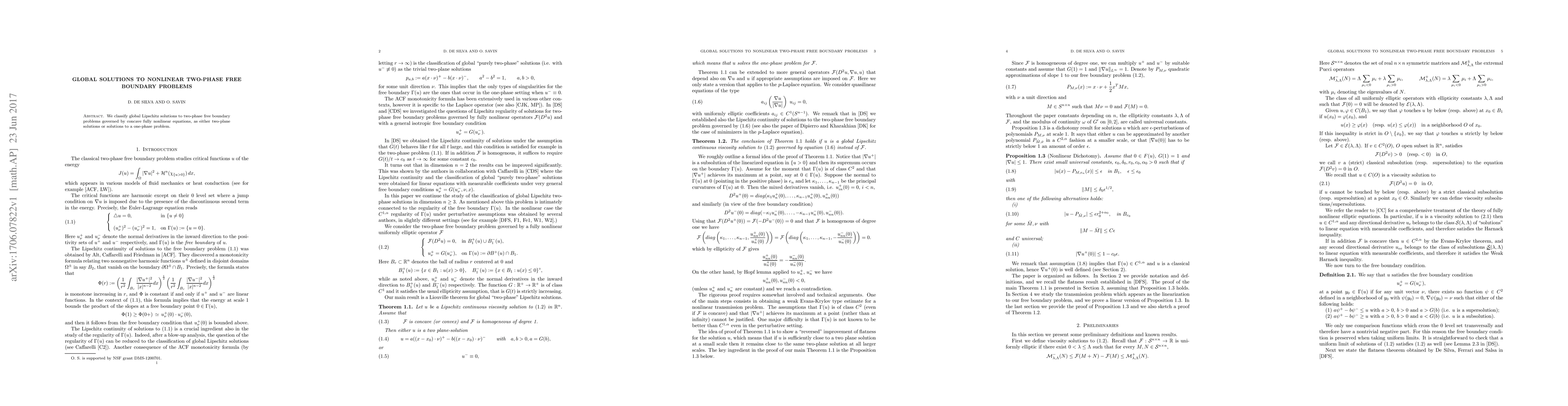 Summary: This paper classifies global Lipschitz solutions to nonlinear two-phase free boundary problems, identifying them as either two-plane solutions or solutions to a one-phase problem. The classification is based on the properties of concave fully nonlinear equations.