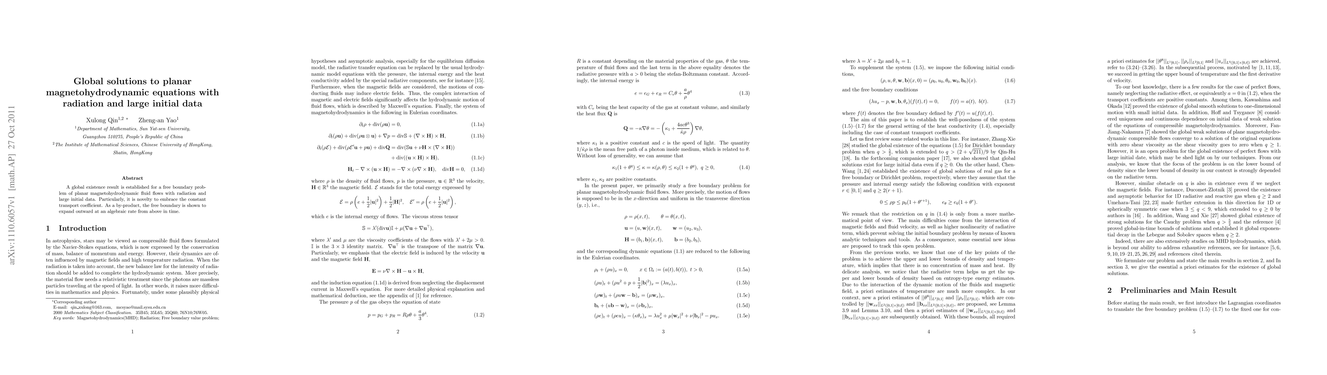 This paper establishes global existence for planar magnetohydrodynamic fluid flows with radiation and large initial data, introducing a novel approach with constant transport coefficients. As a result, the free boundary is shown to expand outward at an algebraic rate over time.