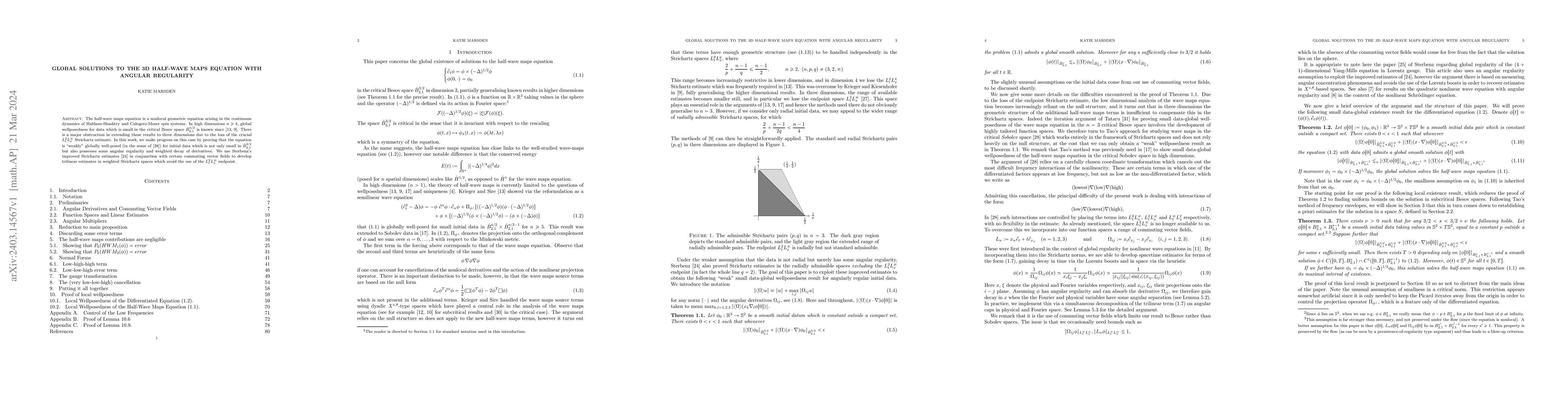The half-wave maps equation is a nonlocal geometric equation arising in the continuum dynamics of Haldane-Shashtry and Calogero-Moser spin systems. In high dimensions $n\geq4$, global wellposedness for data which is small in the critical Besov space $\dot{B}^{n/2}_{2,1}$ is known since the works of Krieger, Sire and Kiesenhofer [13,9]. There is a major obstruction in extending these results to three dimensions due to the loss of the crucial $L^2_tL^\infty_x$ Strichartz estimate. In this work, we make progress on this case by proving that the equation is "weakly" globally well-posed (in the sense of Tao [28]) for initial data which is not only small in $\dot{B}^{3/2}_{2,1}$ but also possesses some angular regularity and weighted decay of derivatives. We use Sterbenz's improved Strichartz estimates in conjunction with certain commuting vector fields to develop trilinear estimates in weighted Strichartz spaces which avoid the use of the $L^2_tL^\infty_x$ endpoint.