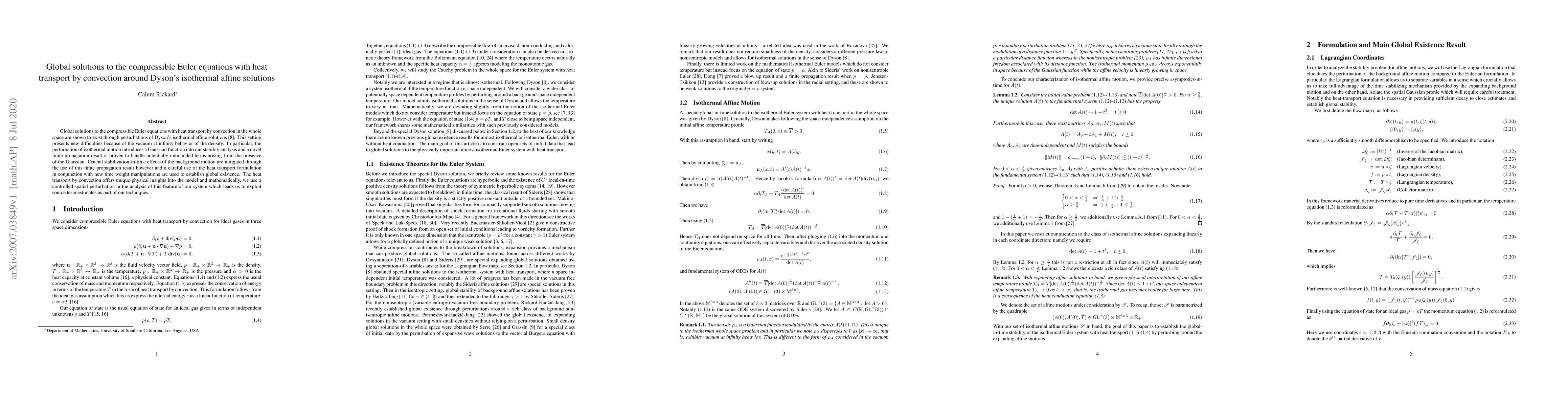 Global solutions to the compressible Euler equations with heat transport by convection in the whole space are shown to exist through perturbations of Dyson's isothermal affine solutions. This setting presents new difficulties because of the vacuum at infinity behavior of the density. In particular, the perturbation of isothermal motion introduces a Gaussian function into our stability analysis and a novel finite propagation result is proven to handle potentially unbounded terms arising from the presence of the Gaussian. Crucial stabilization-in-time effects of the background motion are mitigated through the use of this finite propagation result however and a careful use of the heat transport formulation in conjunction with new time weight manipulations are used to establish global existence. The heat transport by convection offers unique physical insights into the model and mathematically, we use a controlled spatial perturbation in the analysis of this feature of our system which leads us to exploit source term estimates as part of our techniques.