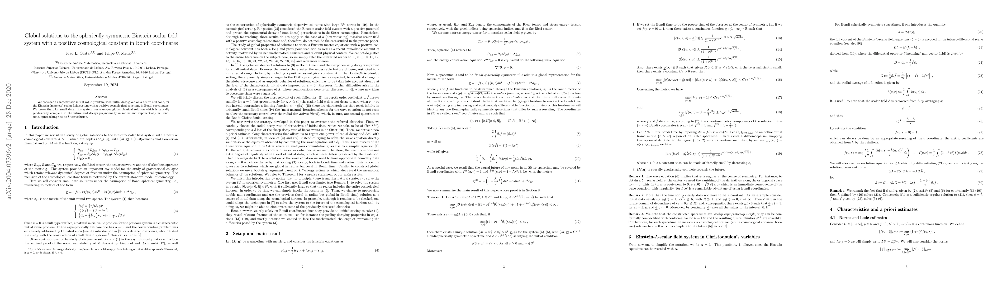 This paper proves that the Einstein-scalar field system with a positive cosmological constant, formulated in Bondi coordinates, has a unique global classical solution for small initial data. The solution is causally geodesically complete and decays polynomially in radius and exponentially in Bondi time, approaching the de Sitter solution.
