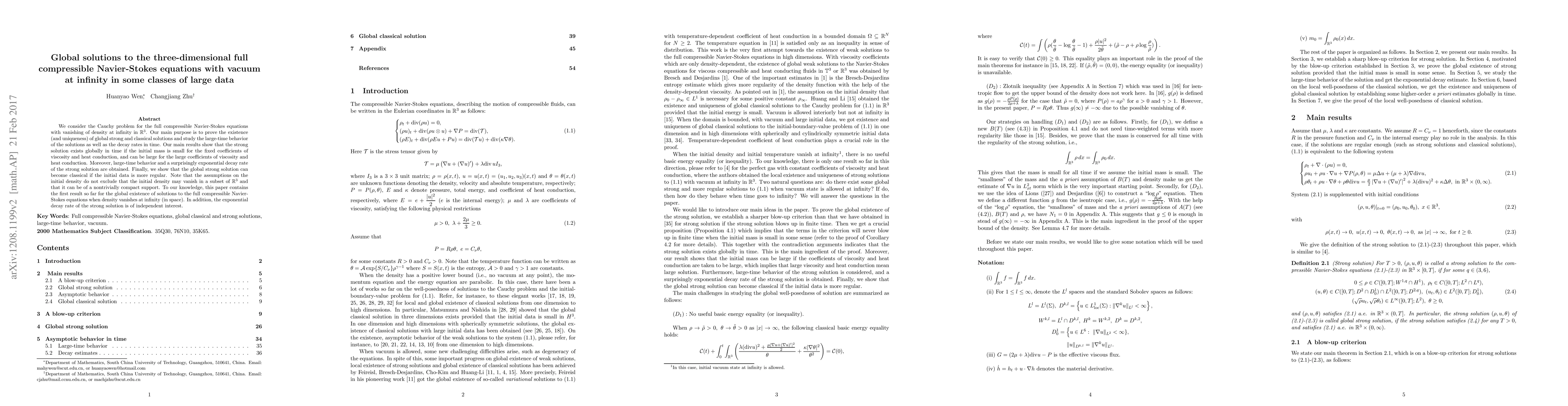 We consider the Cauchy problem for the full compressible Navier-Stokes equations with vanishing of density at infinity in R3. Our main purpose is to prove the existence (and uniqueness) of global strong and classical solutions and study the large-time behavior of the solutions as well as the decay rates in time. Our main results show that the strong solution exists globally in time if the initial mass is small for the fixed coefficients of viscosity and heat conduction, and can be large for the large coefficients of viscosity and heat conduction. Moreover, large-time behavior and a surprisingly exponential decay rate of the strong solution are obtained. Finally, we show that the global strong solution can become classical if the initial data is more regular. Note that the assumptions on the initial density do not exclude that the initial density may vanish in a subset of R3 and that it can be of a non trivially compact support.To our knowledge, this paper contains the first result so far for the global existence of solutions to the full compressible Navier-Stokes equations when density vanishes at infinity (in space). In addition, the exponential decay rate of the strong solution is of independent interest.