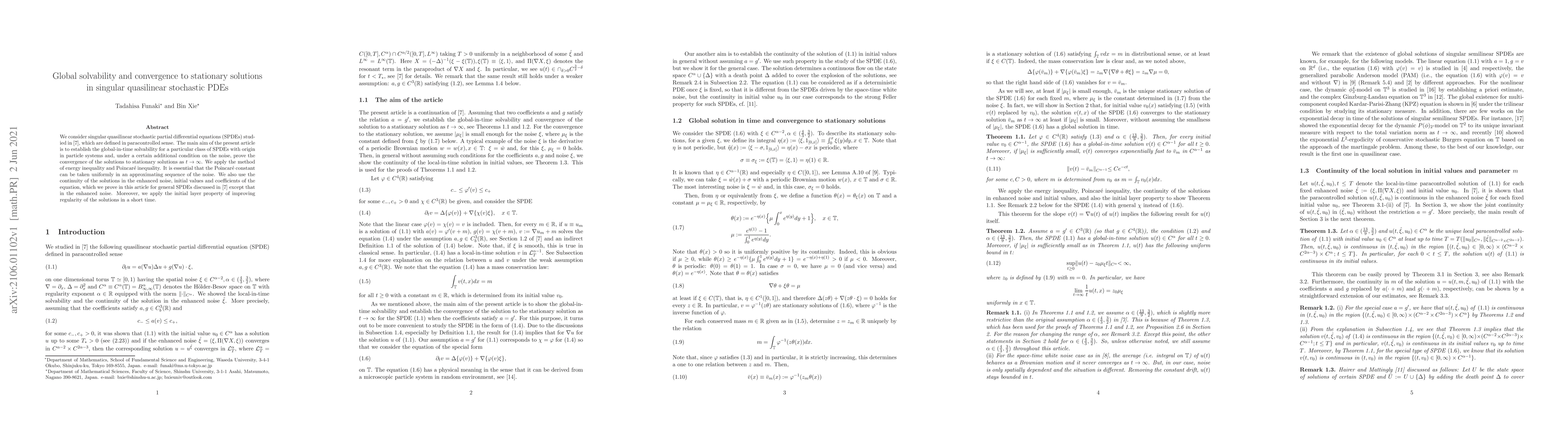 We consider singular quasilinear stochastic partial differential equations (SPDEs) studied in \cite{FHSX}, which are defined in paracontrolled sense. The main aim of the present article is to establish the global-in-time solvability for a particular class of SPDEs with origin in particle systems and, under a certain additional condition on the noise, prove the convergence of the solutions to stationary solutions as $t\to\infty$. We apply the method of energy inequality and Poincar\'e inequality. It is essential that the Poincar\'e constant can be taken uniformly in an approximating sequence of the noise. We also use the continuity of the solutions in the enhanced noise, initial values and coefficients of the equation, which we prove in this article for general SPDEs discussed in \cite{FHSX} except that in the enhanced noise. Moreover, we apply the initial layer property of improving regularity of the solutions in a short time.