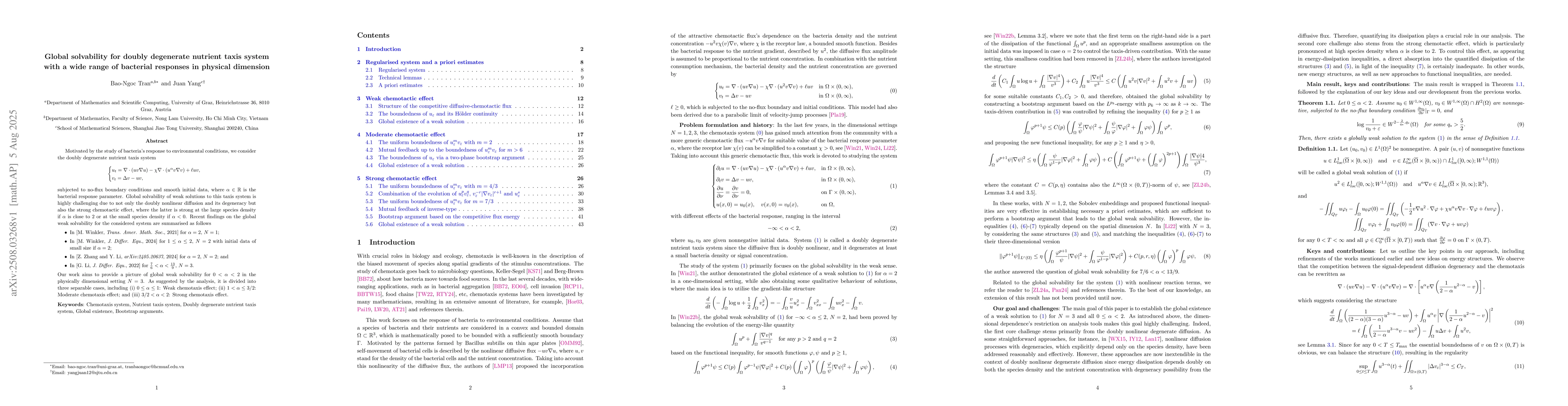 Motivated by the study of bacteria's response to environmental conditions, we consider the doubly degenerate nutrient taxis system \begin{align*} \begin{cases} u_t=\nabla\cdot(uv\nabla u)-\chi\nabla\cdot(u^{\alpha}v\nabla v)+\ell uv,\\ v_t=\Delta v-uv, \end{cases} \end{align*} subjected to no-flux boundary conditions and smooth initial data, where $\alpha\in\mathbb{R}$ is the bacterial response parameter. Global solvability of weak solutions to this taxis system is highly challenging due to not only the doubly nonlinear diffusion and its degeneracy but also the strong chemotactic effect, where the latter is strong at the large species density if $\alpha$ is close to $2$ or at the small species density if $\alpha<0$. Recent findings on the global weak solvability for the considered system are summarised as follows \begin{itemize} \item In [M. Winkler, \textit{Trans. Amer. Math. Soc.}, 2021] for $\alpha=2$, $N=1$; \item In [M. Winkler, \textit{J. Differ. Equ.}, 2024] for $1\le\alpha\le 2$, $N=2$ with initial data of small size if $\alpha=2$; \item In [Z. Zhang and Y. Li, \textit{arXiv:2405.20637}, 2024] for $\alpha=2$, $N=2$; and \item In [G. Li, \textit{J. Differ. Equ.}, 2022] for $\frac{7}{6}<\alpha<\frac{13}{9}$, $N=3$. \end{itemize} Our work aims to provide a picture of global weak solvability for $0\le\alpha<2$ in the physically dimensional setting $N=3$. As suggested by the analysis, it is divided into three separable cases, including (i) $0\le\alpha\le 1$: Weak chemotaxis effect; (ii) $1<\alpha\le 3/2$: Moderate chemotaxis effect; and (iii) $3/2<\alpha<2$: Strong chemotaxis effect.