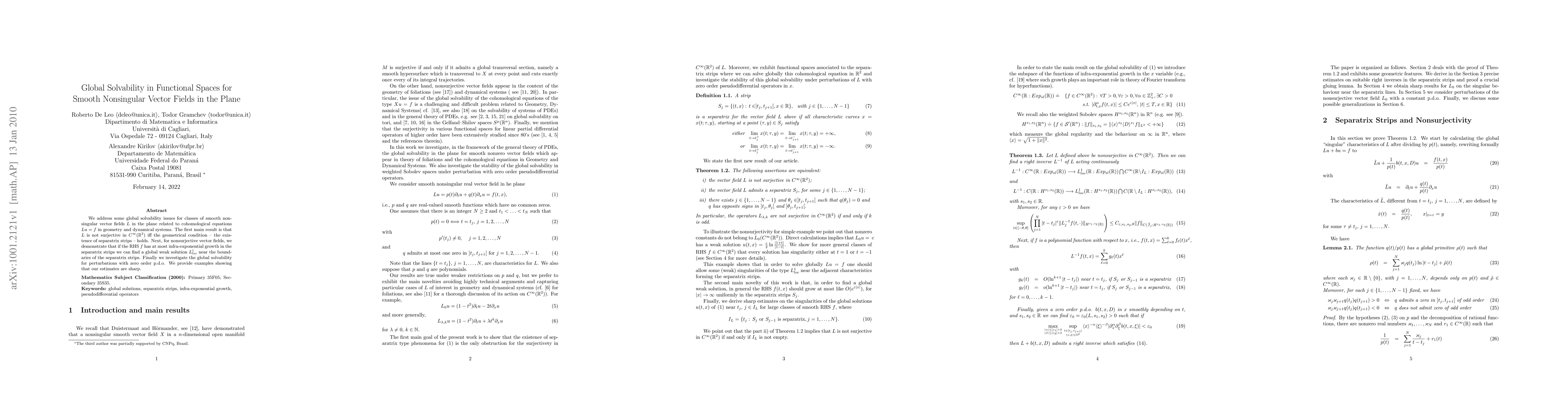 We address some global solvability issues for classes of smooth nonsingular vector fields $L$ in the plane related to cohomological equations $Lu=f$ in geometry and dynamical systems. The first main result is that $L$ is not surjective in $C^\infty(\R^2)$ iff the geometrical condition -- the existence of separatrix strips -- holds. Next, for nonsurjective vector fields, we demonstrate that if the RHS $f$ has at most infra-exponential growth in the separatrix strips we can find a global weak solution $L^1_{loc}$ near the boundaries of the separatrix strips. Finally we investigate the global solvability for perturbations with zero order p.d.o. We provide examples showing that our estimates are sharp.