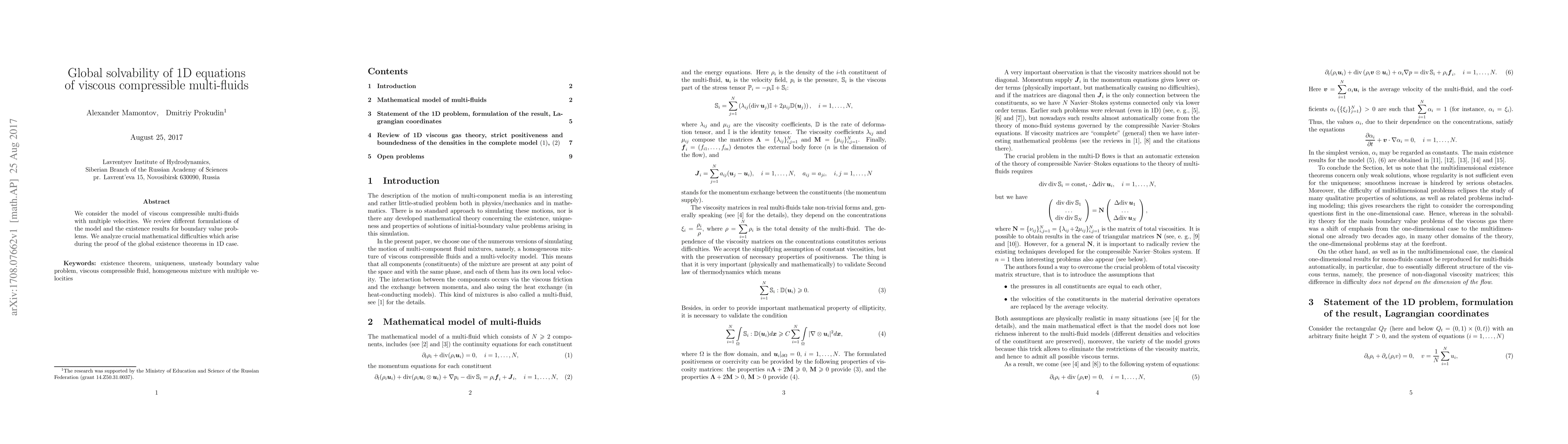 We consider the model of viscous compressible multi-fluids with multiple velocities. We review different formulations of the model and the existence results for boundary value problems. We analyze crucial mathematical difficulties which arise during the proof of the global existence theorems in 1D case.