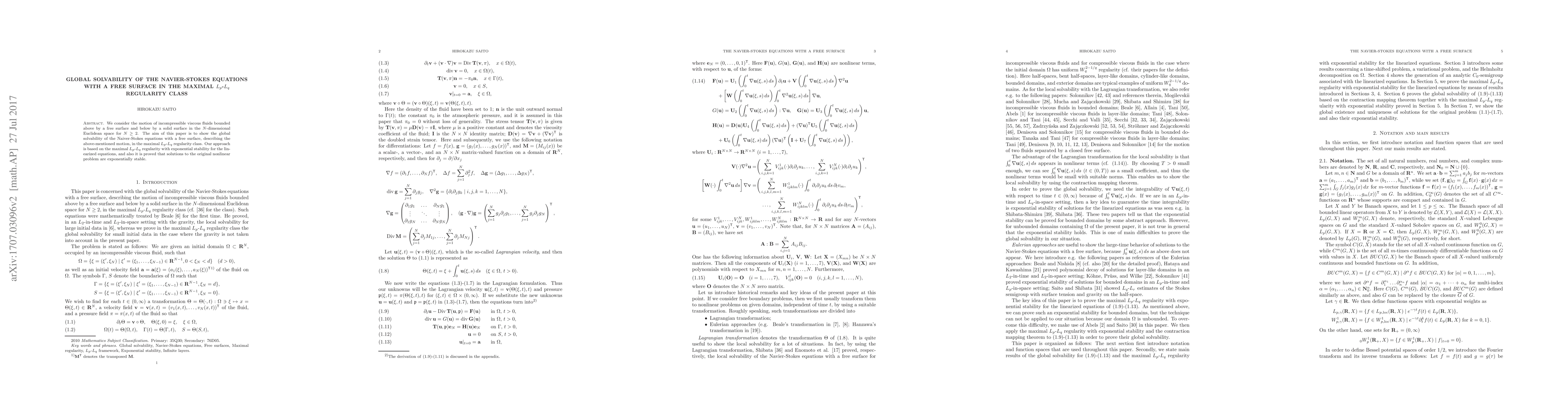 This paper demonstrates global solvability of the Navier-Stokes equations governing incompressible viscous fluids with a free surface, using the maximal $L_p\text{-}L_q$ regularity class. The approach relies on exponential stability for linearized equations, ensuring stability for solutions to the nonlinear problem.