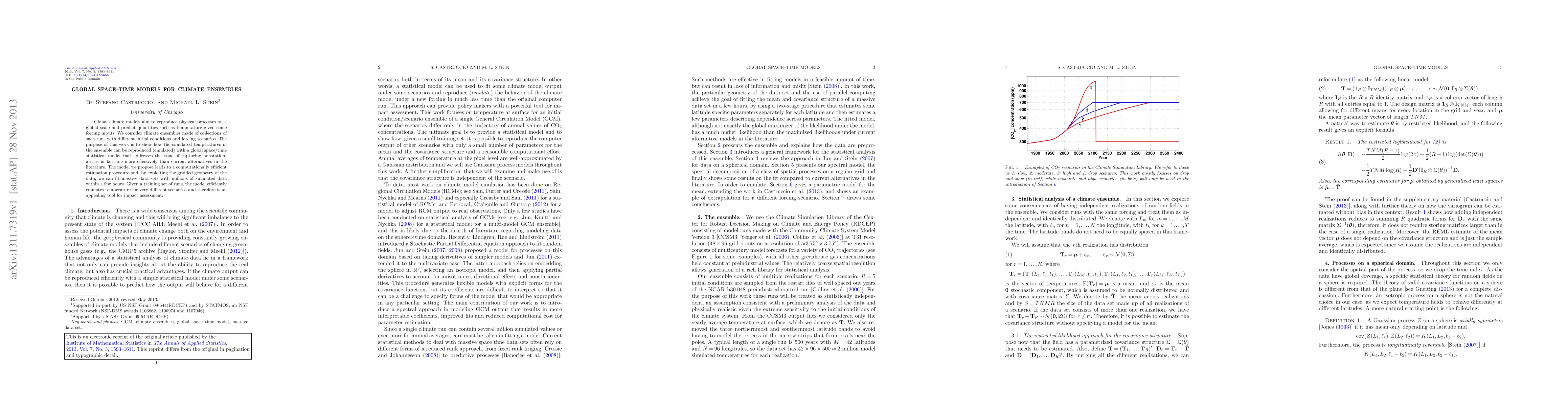 Global climate models aim to reproduce physical processes on a global scale and predict quantities such as temperature given some forcing inputs. We consider climate ensembles made of collections of such runs with different initial conditions and forcing scenarios. The purpose of this work is to show how the simulated temperatures in the ensemble can be reproduced (emulated) with a global space/time statistical model that addresses the issue of capturing nonstationarities in latitude more effectively than current alternatives in the literature. The model we propose leads to a computationally efficient estimation procedure and, by exploiting the gridded geometry of the data, we can fit massive data sets with millions of simulated data within a few hours. Given a training set of runs, the model efficiently emulates temperature for very different scenarios and therefore is an appealing tool for impact assessment.