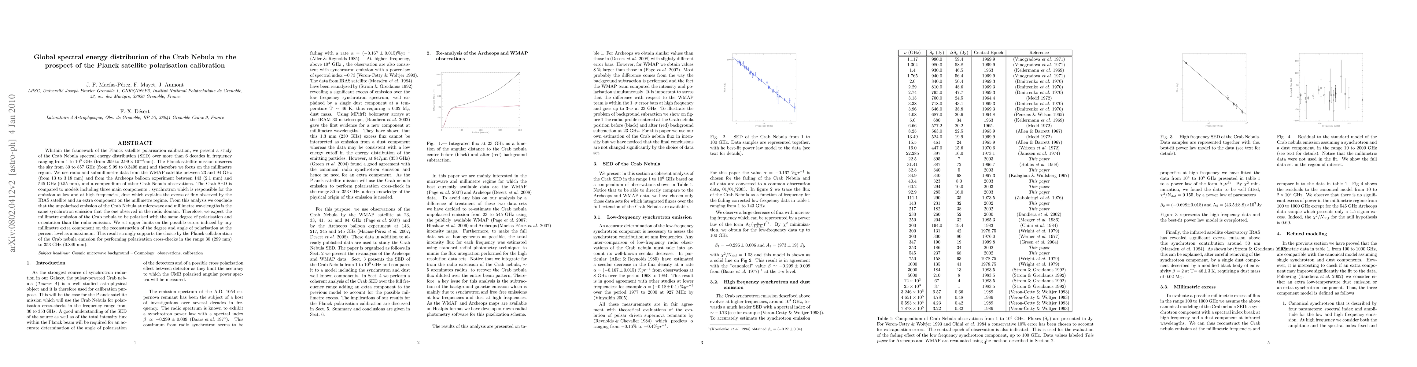 Whithin the framework of the Planck satellite polarisation calibration, we present a study of the Crab Nebula spectral energy distribution (SED) over more than 6 decades in frequency ranging from 1 to $\rm 10^6 GHz$. The Planck satellite mission observes the sky from 30 to 857 GHz and therefore we focus on the millimetre region. We use radio and submillimetre data from the WMAP satellite between 23 and 94 GHz (from 13 to 3.18 mm) and from the Archeops balloon experiment between 143 (2.1 mm) and 545 GHz (0.55 mm), and a compendium of other Crab Nebula observations. The Crab SED is compared to models including three main components : synchrotron which is responsible for the emission at low and at high frequencies, dust which explains the excess of flux observed by the IRAS satellite and an extra component on the millimetre regime. From this analysis we conclude that the unpolarised emission of the Crab Nebula at microwave and millimetre wavelengths is the same synchrotron emission that the one observed in the radio domain. Therefore, we expect the millimetre emission of the Crab nebula to be polarised with the same degree of polarisation and orientation than the radio emission. We set upper limits on the possible errors induced by any millimetre extra component on the reconstruction of the degree and angle of polarisation at the percent level as a maximum. This result strongly supports the choice by the Planck collaboration of the Crab nebula emission for performing polarisation cross-checks in the range 30 (299 mm) to 353 GHz (0.849 mm).